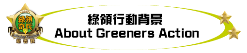 | 綠領行動 Greeners Action (原名: 綠色學生聯會 Green Student Council) 是一個本地註冊環保組織 成立於1993年,由一班大學生及不同專業的在職青年義務組成。及後,正式註冊為慈善團體,並由全職職員維持本會業務。本會旨在宣傳、推廣環保訊息,以及關注社會的環保事宜。 Greeners Action (formerly: Green Student Council) is a local environmental group Established in 1993 and comprising volunteers who are university students and professional youth Afterward, we have registered as a charitable group and operated by a team of full-time staff Aim at promoting the message of environmental protection and expressing concern about environmental issues. |