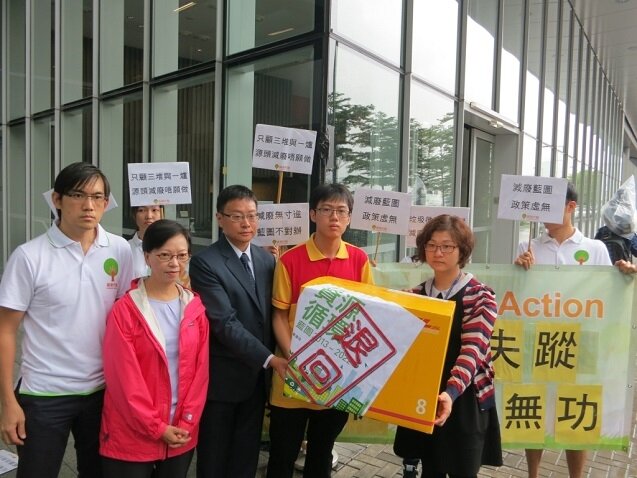 「人生有幾多個十年」?環境局口說減廢,《都市固體廢物管理政策大綱(2005-2014)》所涵蓋的十年過去,減廢失敗,浪費十年後,又推出《香港資源循環藍圖2013-2022》(下稱:減廢藍圖),但一屆議會會期又過去,政策卻無法跟上目標,如同廢紙,公眾不能收貨。綠領行動委託速遞員把貨不對辦的《減廢藍圖》退回環境局!