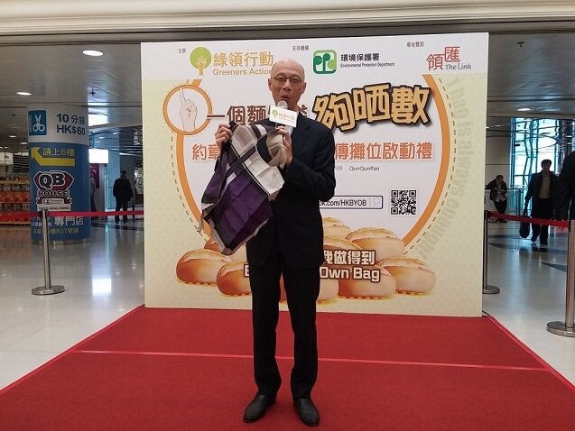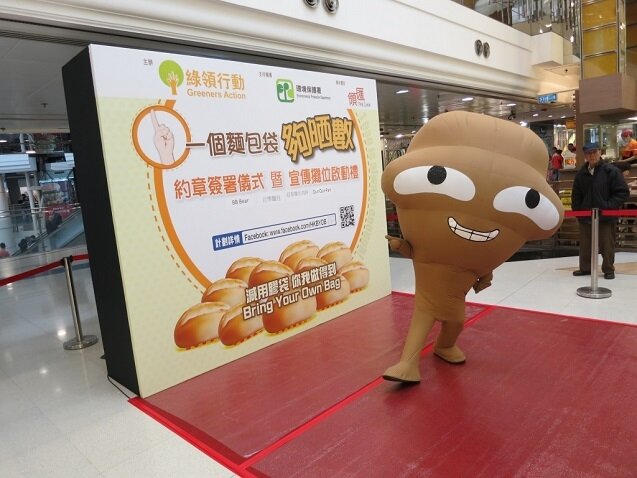 今日在慈雲山中心舉行的《一個麵包袋夠晒數》約章簽署儀式,環境局局長黃錦星先生聯同大嘥鬼呼籲其他業界人士參考約章,定出減少使用膠袋的措施,並提醒大家「咪做大嘥鬼」!