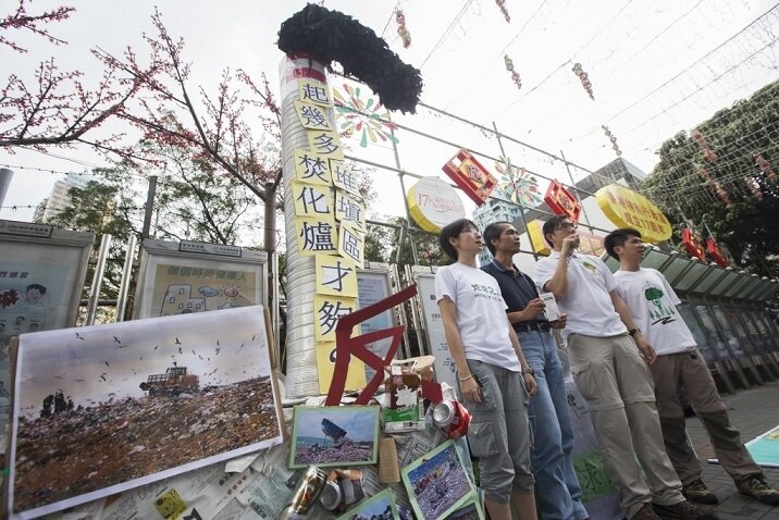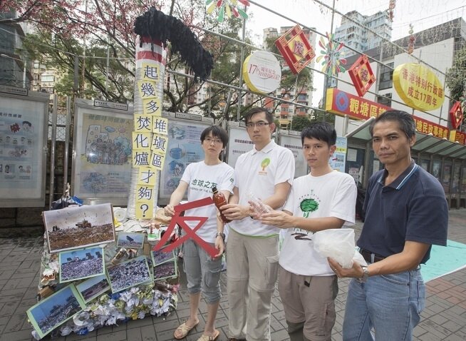 政府準備向立法會財務委員會申請「三堆一爐」撥款,綠領行動、香港地球之友、長春社、綠色力量共四個環保團體,在街頭展示寫上「起幾多堆填區焚化爐才夠?」的巨型煙囪模型,諷刺政府如果源頭減廢不力,即使興建更多末端處理設施也不足以應付有增無減的垃圾。團體又呼籲市民簽名,要求政府落實環團早前提出的減廢「辣招」,以証明其推動源減頭廢的決心。