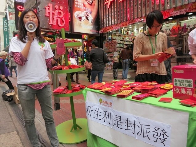 綠領行動將收集到的利是封經篩選分類後變成『新生利是封』,昨日和今日分別出動20名義工,於銅鑼灣及旺角行人專用區派發5萬個「新生利是封」,並舉行重用利是封工作坊,即場示範教導市民做新年掛飾,減少浪費,重用資源,過一個環保的新年。現場反應熱烈,共有1000名市民支持。
