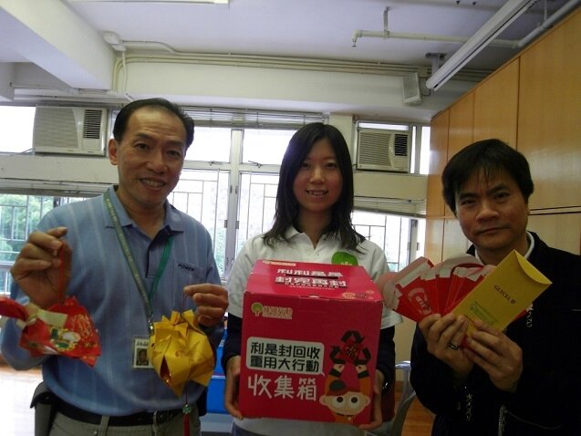 Greeners Action has launched the Lai See Package Reusing Program since 2010. Last year, 900 thousand red packets were collected and after careful sorting, 450 thousand red packets had been recycled and turned to be the “new” red packets. Starting from today, the “new” red packets will be distributed in 50 primary and secondary schools, tertiary institutions and 20 housing estates or organizations. 1.29 million red packets has been recycled over the past three years since the program started (see table 1) which means that 66 trees were saved from be cut down while 17 thousand kilograms of carbon release has been reduced.