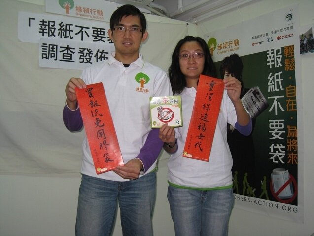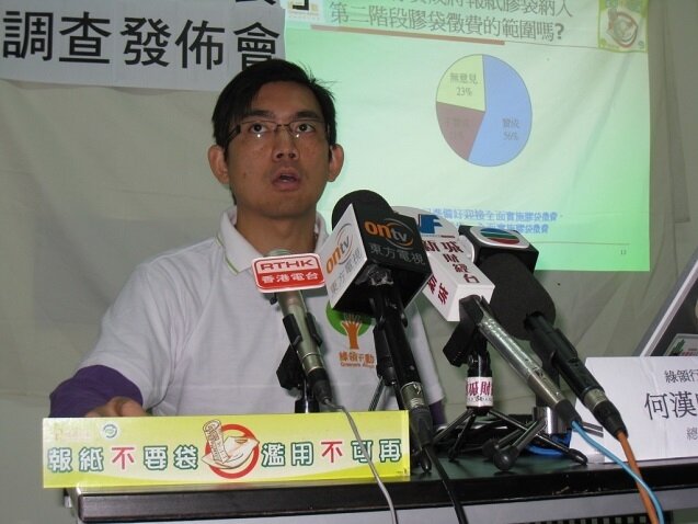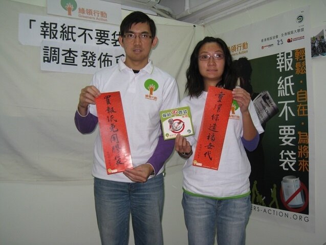 膠袋徵費實施超過一年半,登記零售店的膠袋使用量大減9成,但報紙膠袋仍然是本港膠袋濫用的黑點,2009年便有1億2千萬個報紙膠袋被棄置於堆填區。本會於2010年10月至12月期間進行了一項有關市民使用報紙膠袋的意見調查,發現只有2成人認為報紙膠袋是必須的,比較2008年的5成大幅下降2倍半;有7成人贊成停用報紙膠袋,數字反映市民已準備好迎接全面實施膠袋徵費,綠領行動促請政府加快腳步,全面實施膠袋徵費。