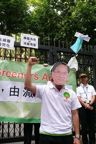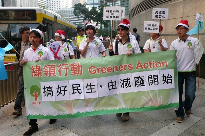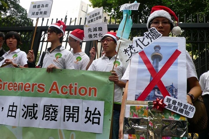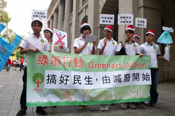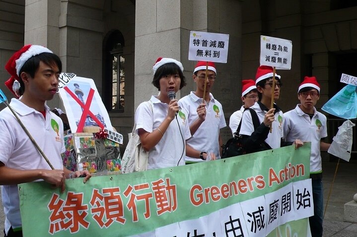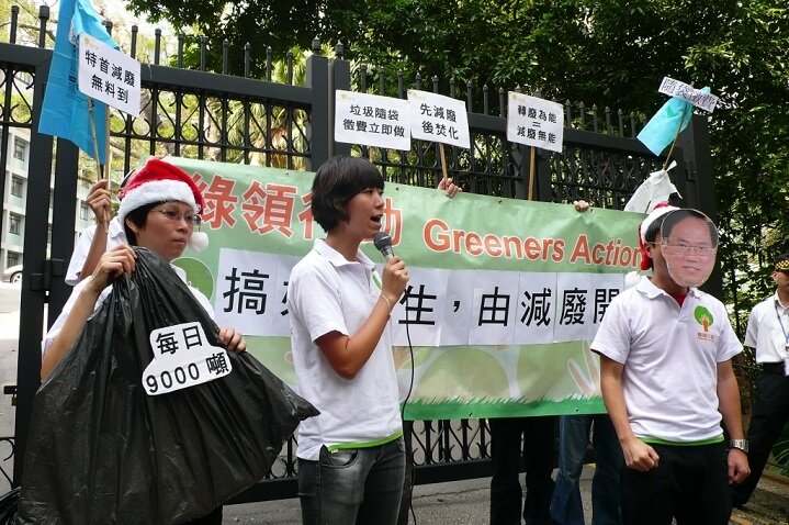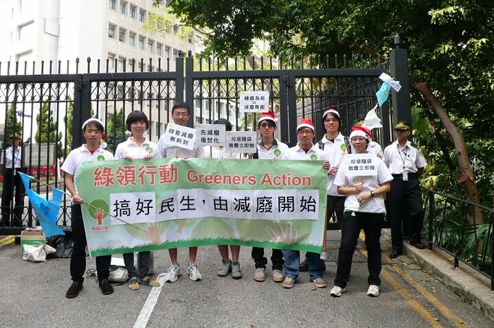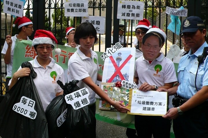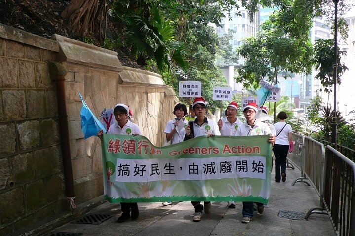 綠領行動一行十人今日發起遊行,以聖誕老人打扮到政府總部提前致送聖誕禮物 – 焚化爐給特首,並把一袋袋的垃圾放置於政府總部,並把一袋袋的垃圾放置於政府總部,最後遞交「垃圾徵費方案」建議書,促使特首在任期內「做好減廢呢份工」。