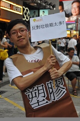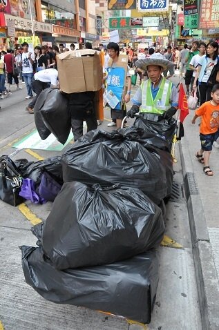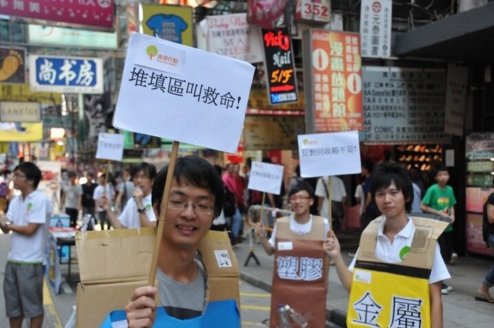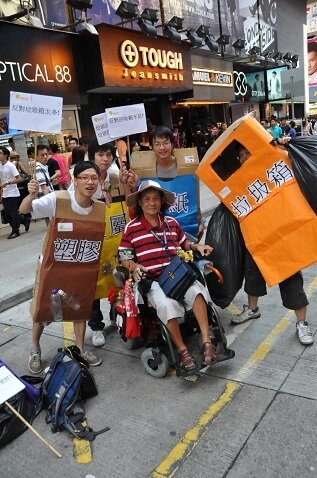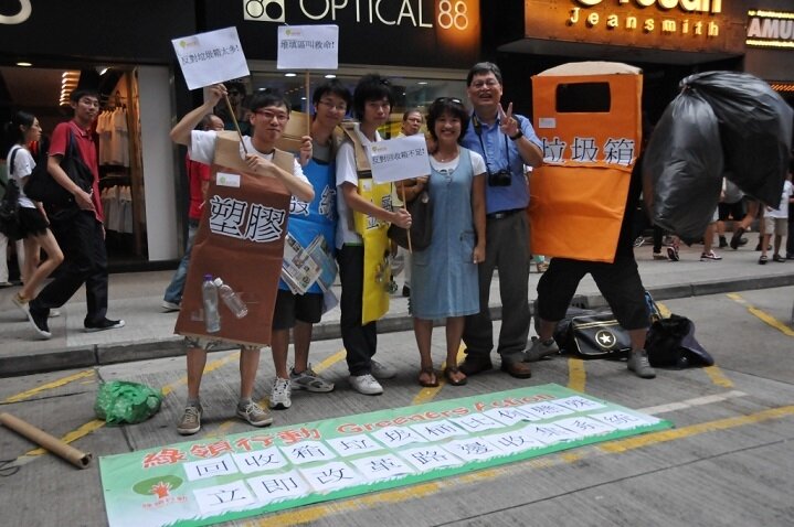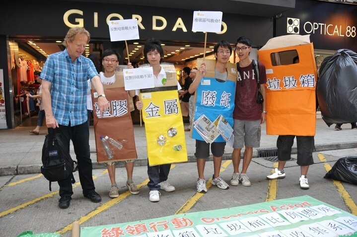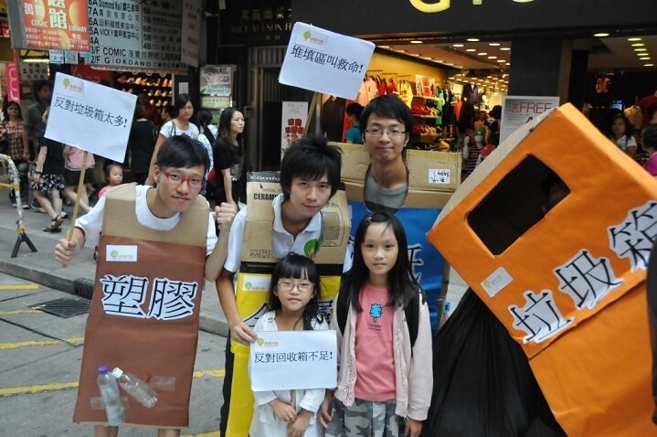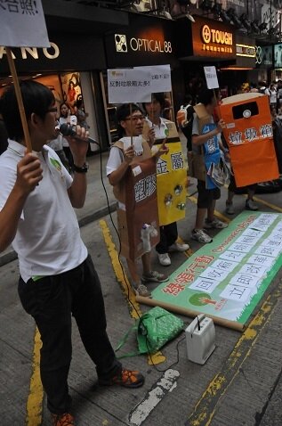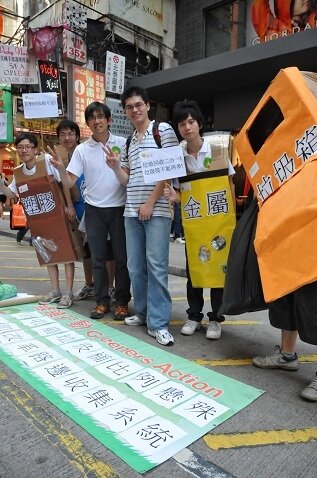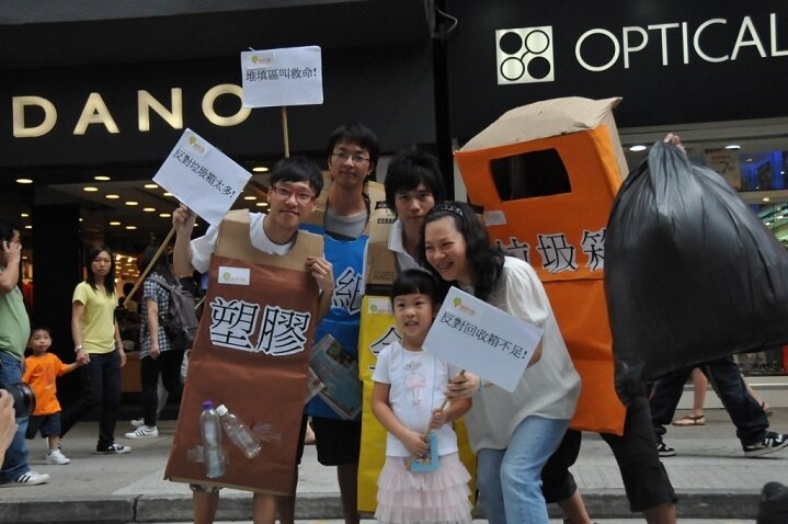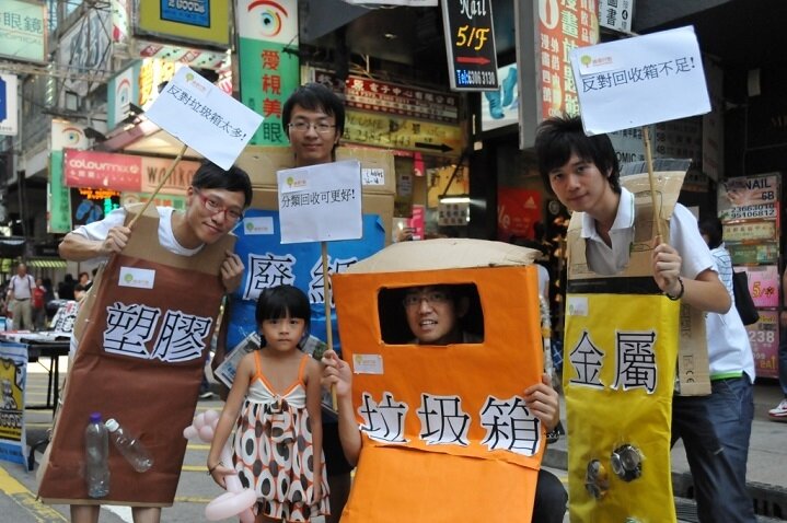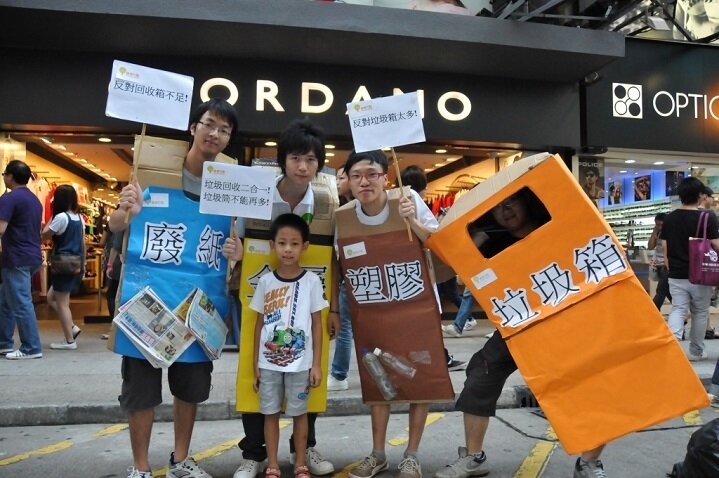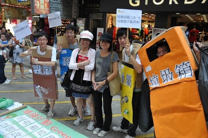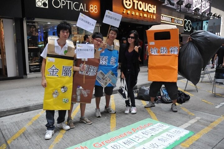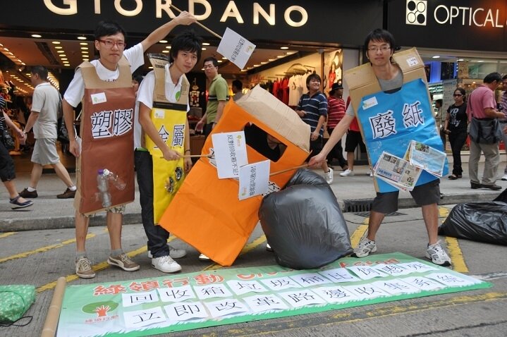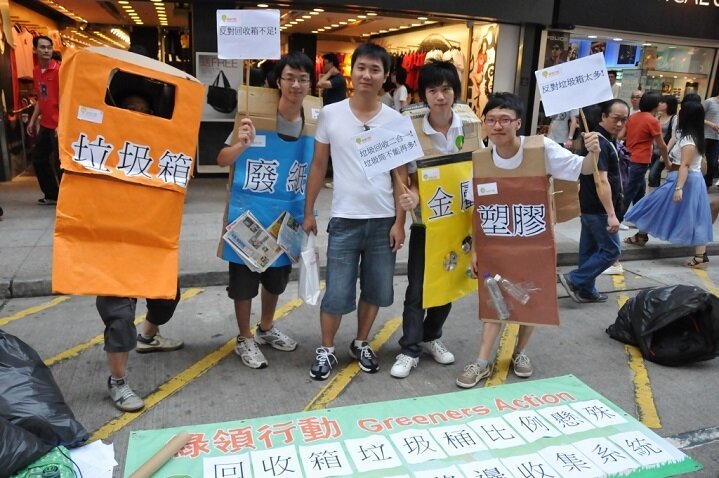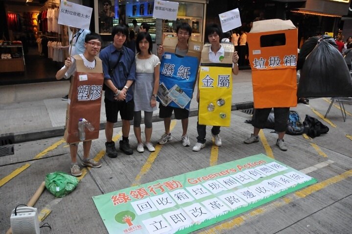 綠領行動今日於旺角舉行街頭活動,成員打扮成「垃圾桶人」和「回收箱人」現身旺角行人專用區表演街劇。「垃圾桶人」說:「我人強馬壯,胃口又大,回收吾回收一於好小理…」;「藍紙、黃罐、啡膠樽的回 收箱人」卻說出:「政府唔理我哋,又放埋一邊,數量小到離譜…」,以街頭劇的形式諷刺由於政府的荒謬政策,令香港十多年來的廢物回收率偏低。
