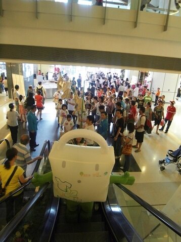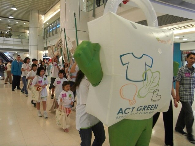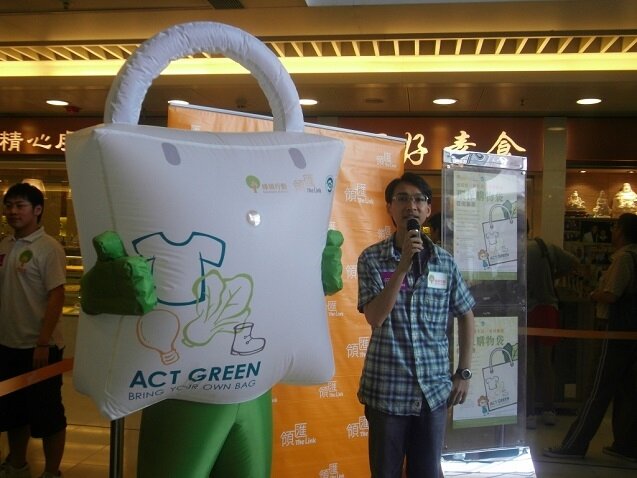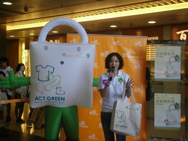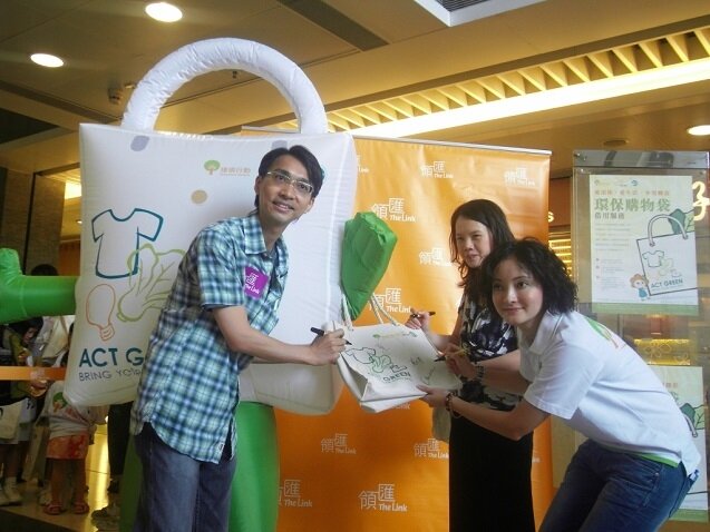 There are only 16 days to go for the implementation of plastic bag levy scheme on 07th July, 2009. The Greeners Action together with the Link property management limited today pushed ahead a unique service in Hong Kong, which is to provide rent service of umbrella bag. The campaign, gaining full support of 33 shopping malls under Link estate property management limited, aims at encouraging citizen to develop habit of reducing using plastic bags by bringing their own one. The opening ceremony of the campaign started today (21st June, 2009) in Wong Tai Sin Lung Cheung mall, during which Political assistant of Secretary for the Environment Ms. Linda CHOI, representative of the Greeners Action Ms Karen Hung and senior manager of the Link estate property management Mr. Leung, together held the opening ceremony and signed on the Eco-bag to show their support to the scheme. After the ceremony, guests paraded in the shopping malls along with Eco-bag-made cuddle dragon to present new ways of reducing use of plastic bags.