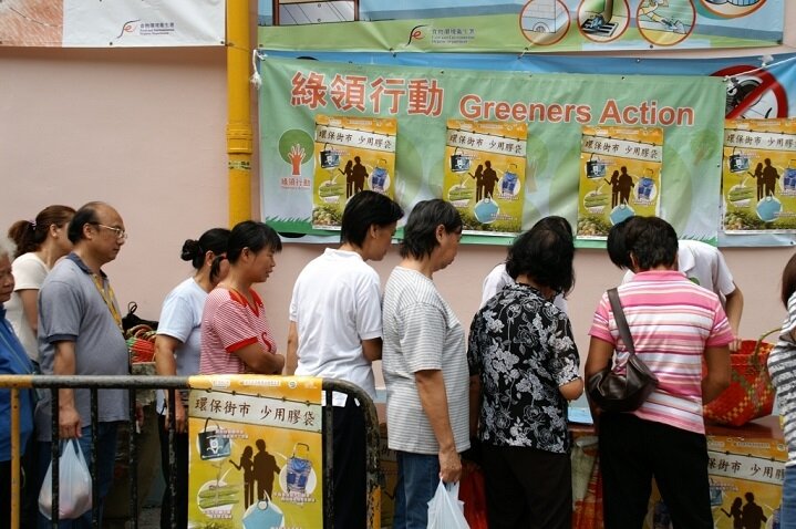 綠領行動為進一步推廣市民於街市買菜時減用及善用膠袋,以及使用環保袋及菜籃等,今日聯同超過十名義工於油麻地街市設置換領攤位。活動於上午十一時開始,義工在街市呼籲市民買餸時自備購物袋、少用膠袋,並提醒市民可把多種不同的瓜菜放進同一個袋裡。
