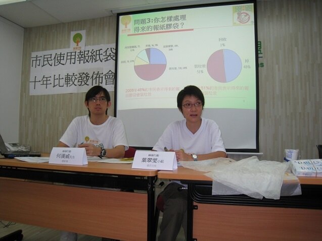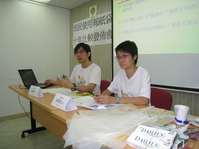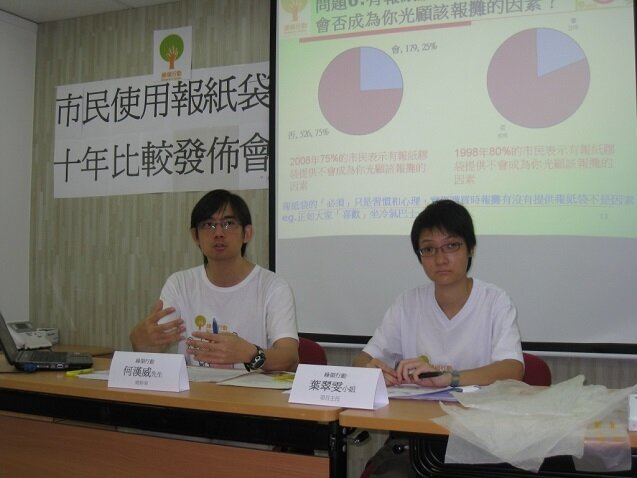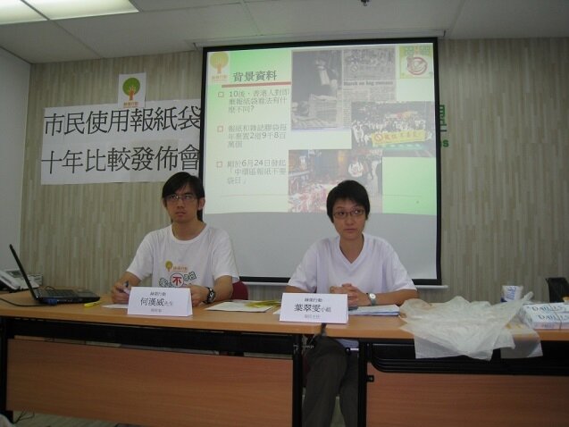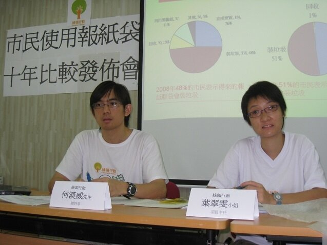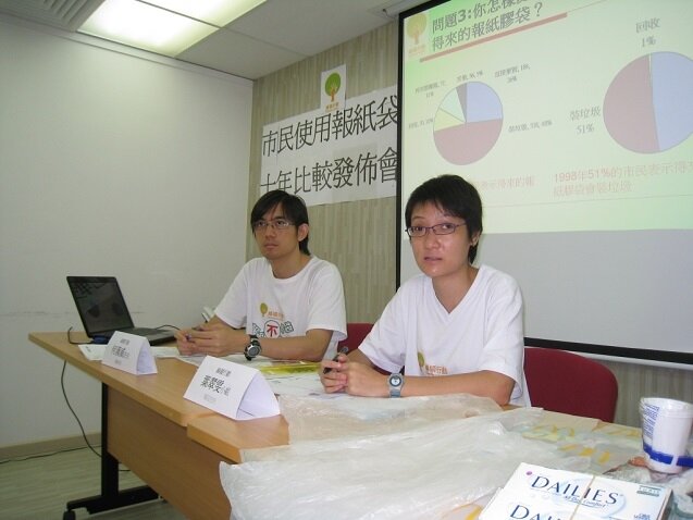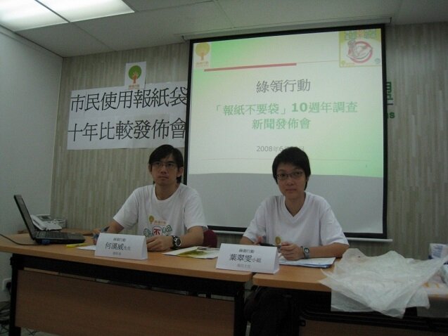 1998年年底,綠色學生聯會(現為綠領行動)曾訪問市民對新興報紙膠袋的看法及意見,事隔10年,本會於上月再進行同類市民使用報紙膠袋的意見調查,於港、九、新界各區(包括中環、旺角、黃埔、大埔、天水圍及青衣等),繁忙及非繁忙時間於報販附近成功訪問996位剛買完報紙的市民,以了解他們使用報紙膠袋的習慣及意見。根據調查所得,有高達91%的市民表示購買報紙的地方有膠袋提供,比較10年前同樣的意見調查的70%增加了21%,反映現時報紙膠袋濫用的情況更加普及。同時有49%的市民覺得使用報紙膠袋是必須的,比較10年前的只有21%,增長達28%,反映市民使用報袋膠袋已成習慣,認為報紙膠袋在生活上是必不可少的。