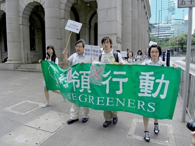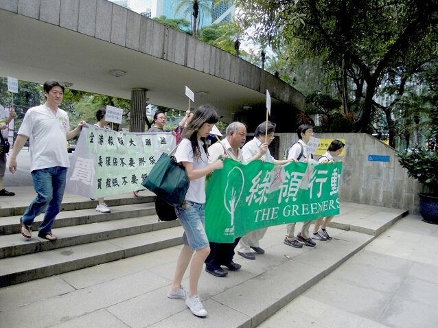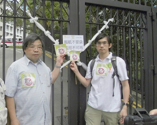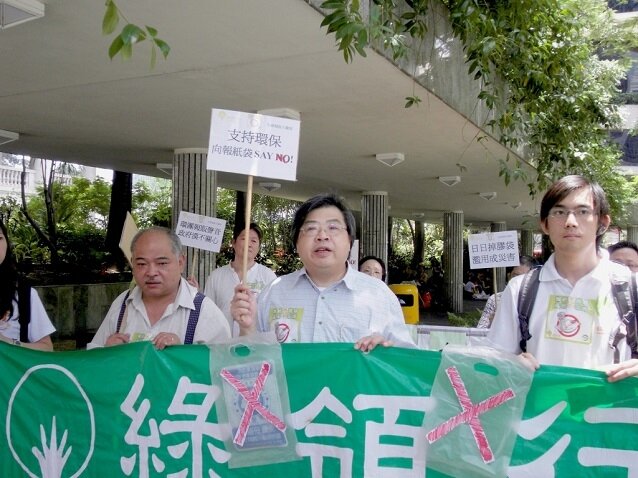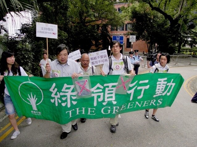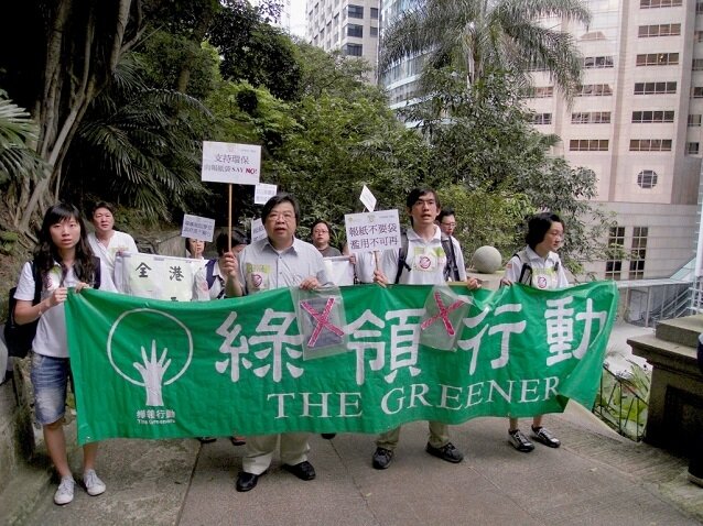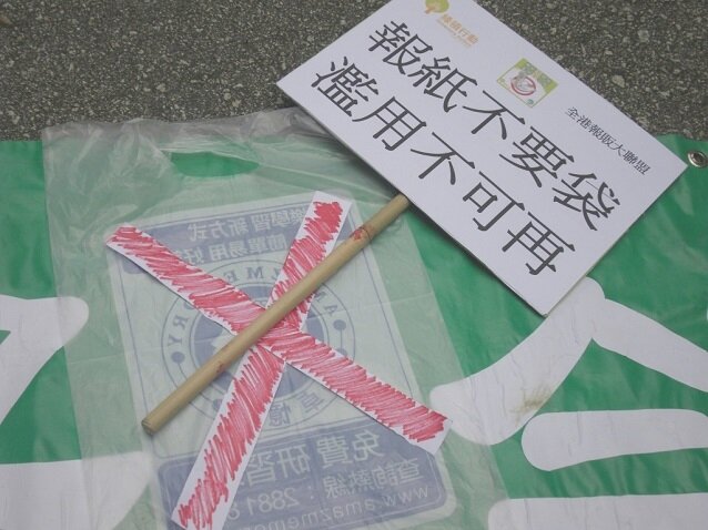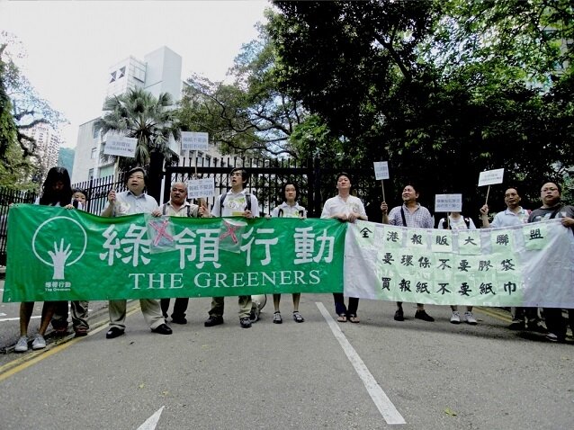 為表達環保團體與報販的停用報紙膠袋的共同訴求,綠領行動今天聯同全港報販大聯盟及中西區的報販約20人,打破沉默,帶同近50個中上環報販簽名,團結一致,強烈表示(1)反對政府多年漠視報紙膠袋濫用問題及(2)要求政府立例禁止用膠袋盛載報紙出售,希望最終能停派報紙膠袋以響應環保。遊行隊伍更帶同致環境局局長邱騰華的請願信,由遮打花園遊行到政府總部,沿途高標語及叫口號「報紙不要袋,濫用不可再」、「要環保,不要膠袋」,最後更用報紙膠袋於政府總部門前束成一個大型交叉,喻意「報紙不要袋,濫用不可再」,要求政府當局規管報紙膠袋的派發及要求全面停止市面以膠袋盛載報紙出售。