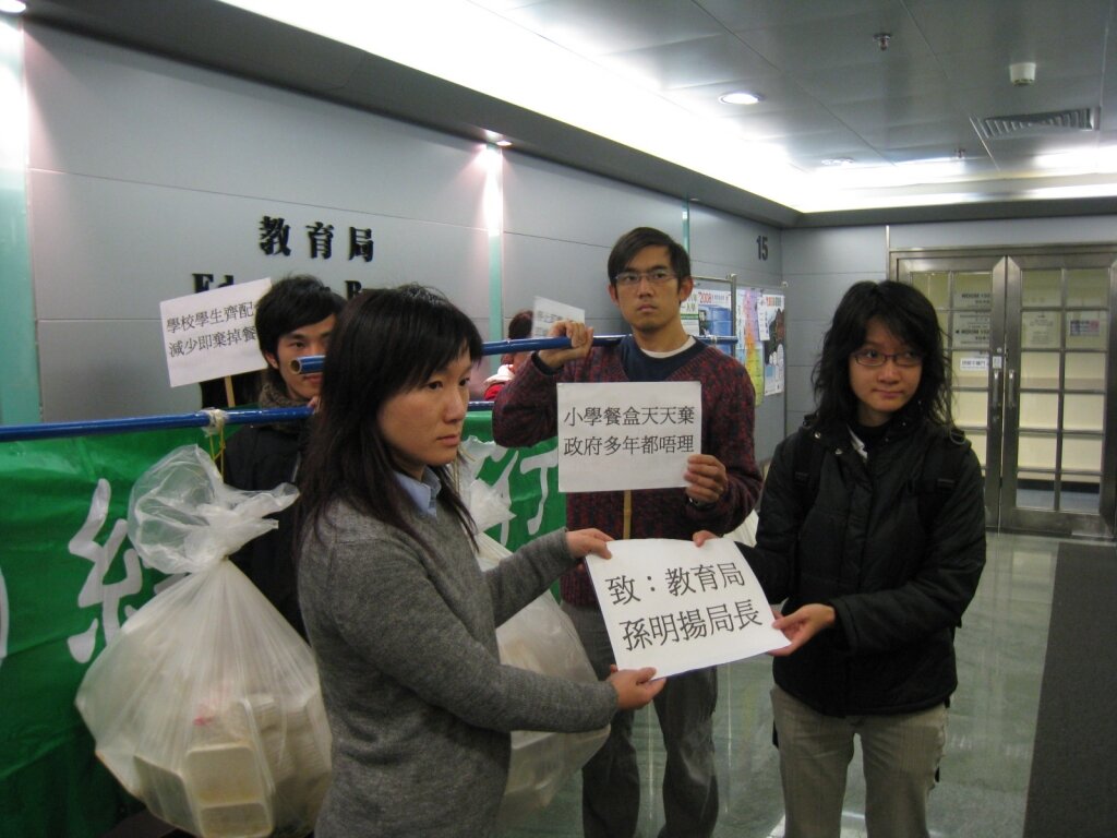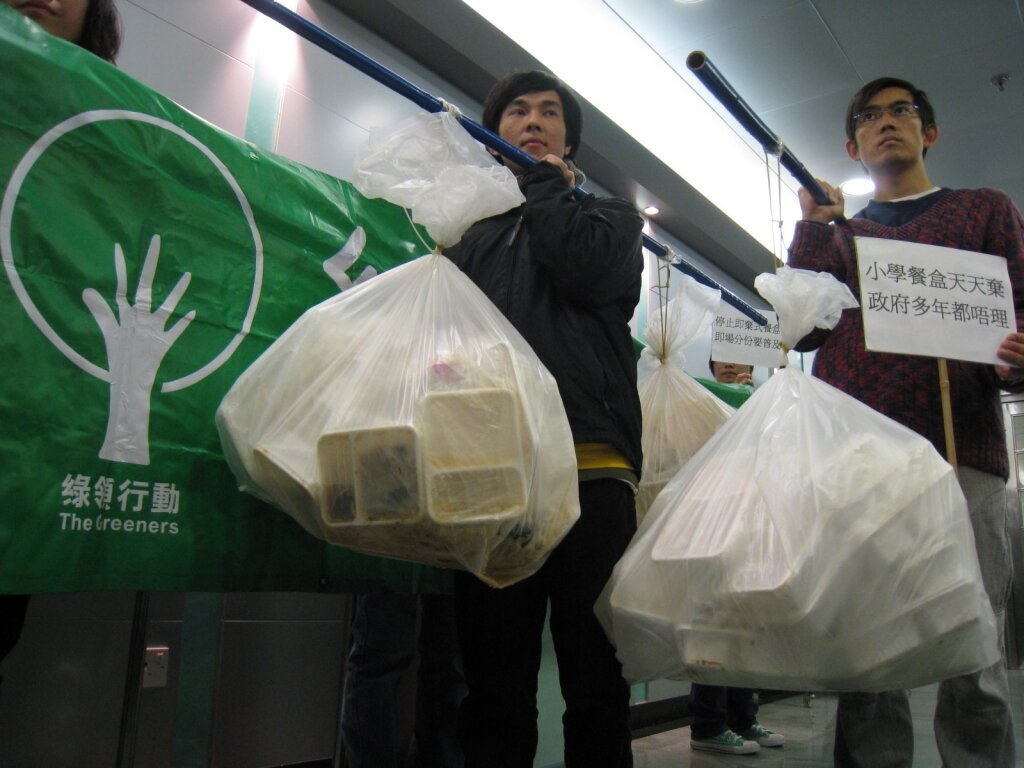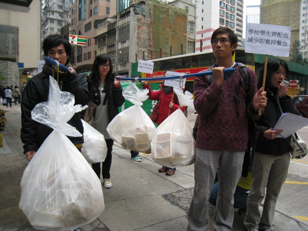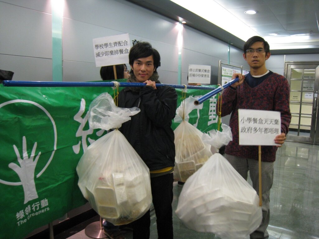 綠領行動(原綠色學生聯會)一直關注有關小學午餐飯盒棄置問題,要求政府注視全港40萬小學生的環保午膳供應安排,堵塞政府多年來的政策漏洞,推動全港小學均使用可清洗重用的飯盒及餐具,以至即場分份。本會將聯同十數名義工,將由回收場從小學收集得來相等於4班小學的數百個即棄飯盒及廚餘,以「擔挑」帶著該即棄飯盒遊行至教育局胡忠大廈總部,並送交請願信,要求立即正視環保午膳問題,希望教育局在新的一年,立即制定環保午膳政策,全面實施小學環保午膳。