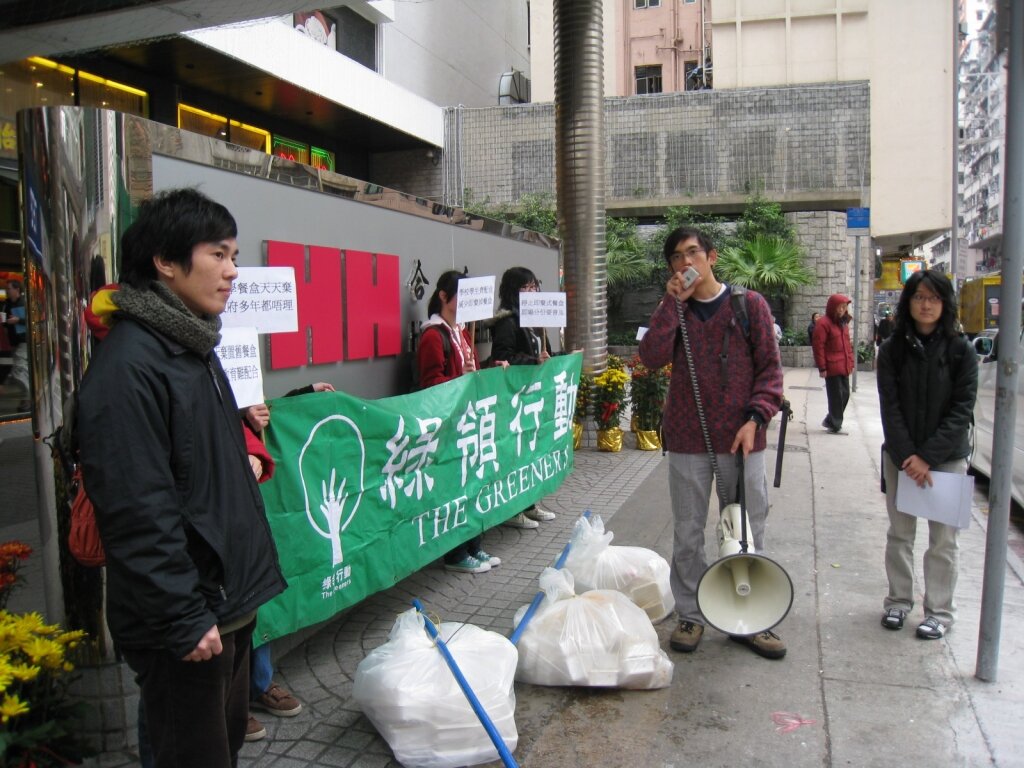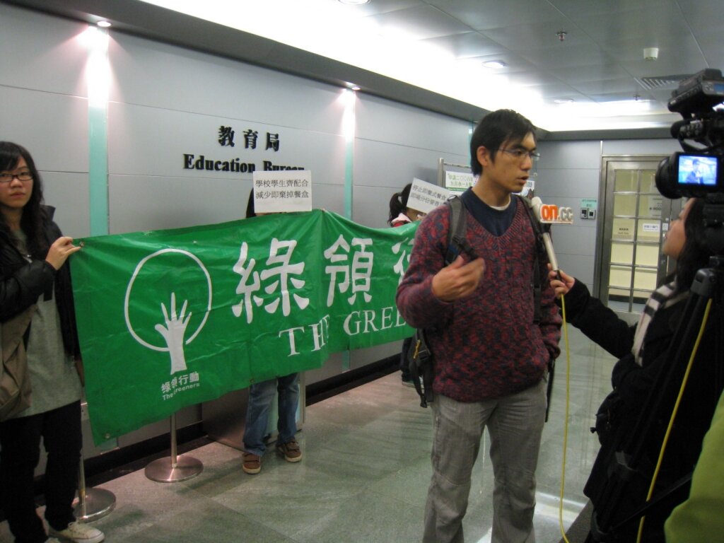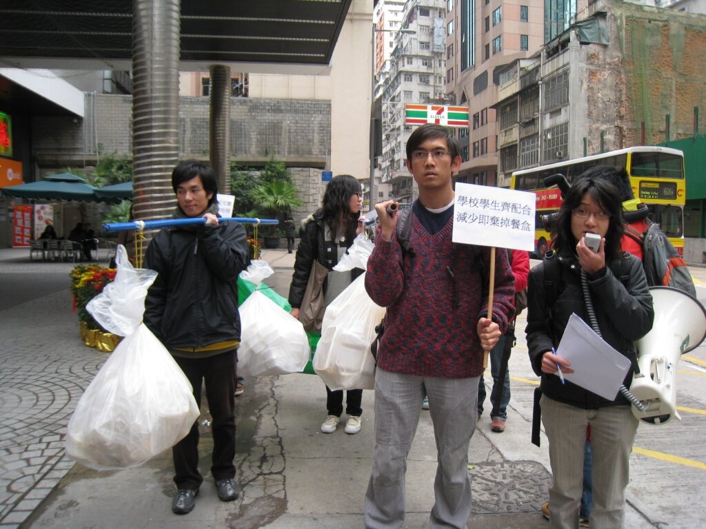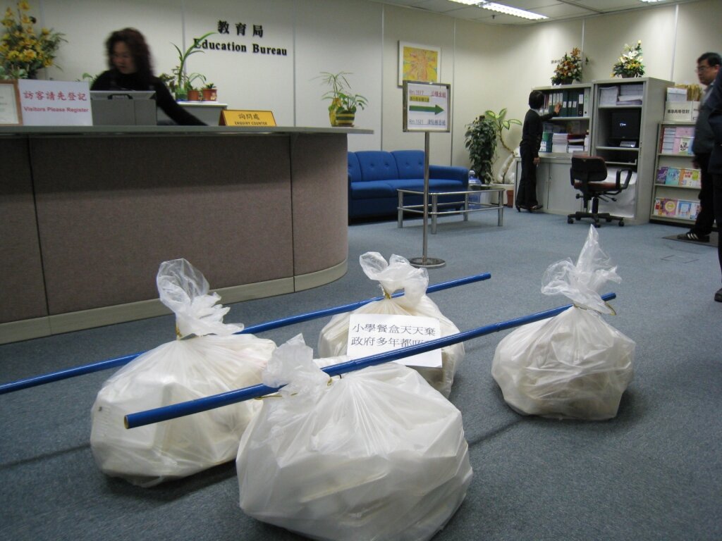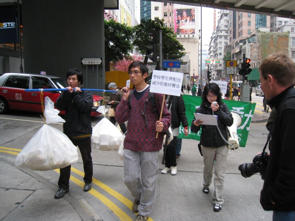 綠領行動(原綠色學生聯會)一直關注有關小學午餐飯盒棄置問題,要求政府注視全港40萬小學生的環保午膳供應安排,堵塞政府多年來的政策漏洞,推動全港小學均使用可清洗重用的飯盒及餐具,以至即場分份。本會將聯同十數名義工,將由回收場從小學收集得來相等於4班小學的數百個即棄飯盒及廚餘,以「擔挑」帶著該即棄飯盒遊行至教育局胡忠大廈總部,並送交請願信,要求立即正視環保午膳問題,希望教育局在新的一年,立即制定環保午膳政策,全面實施小學環保午膳。