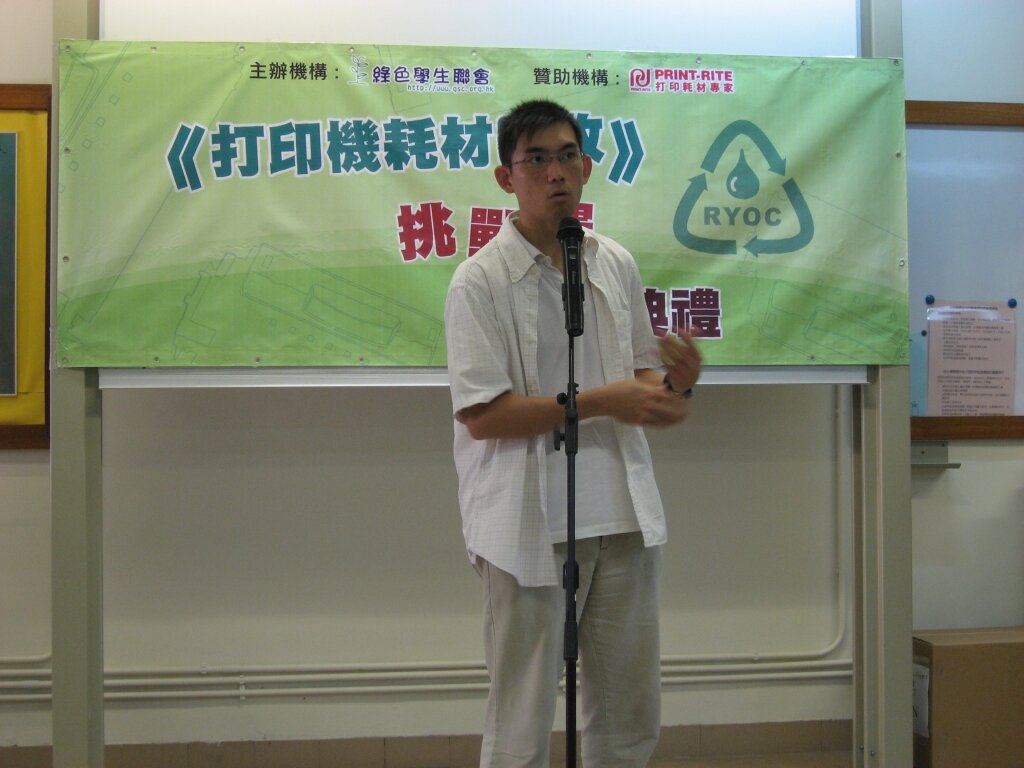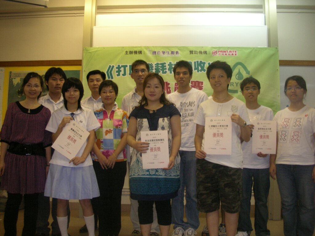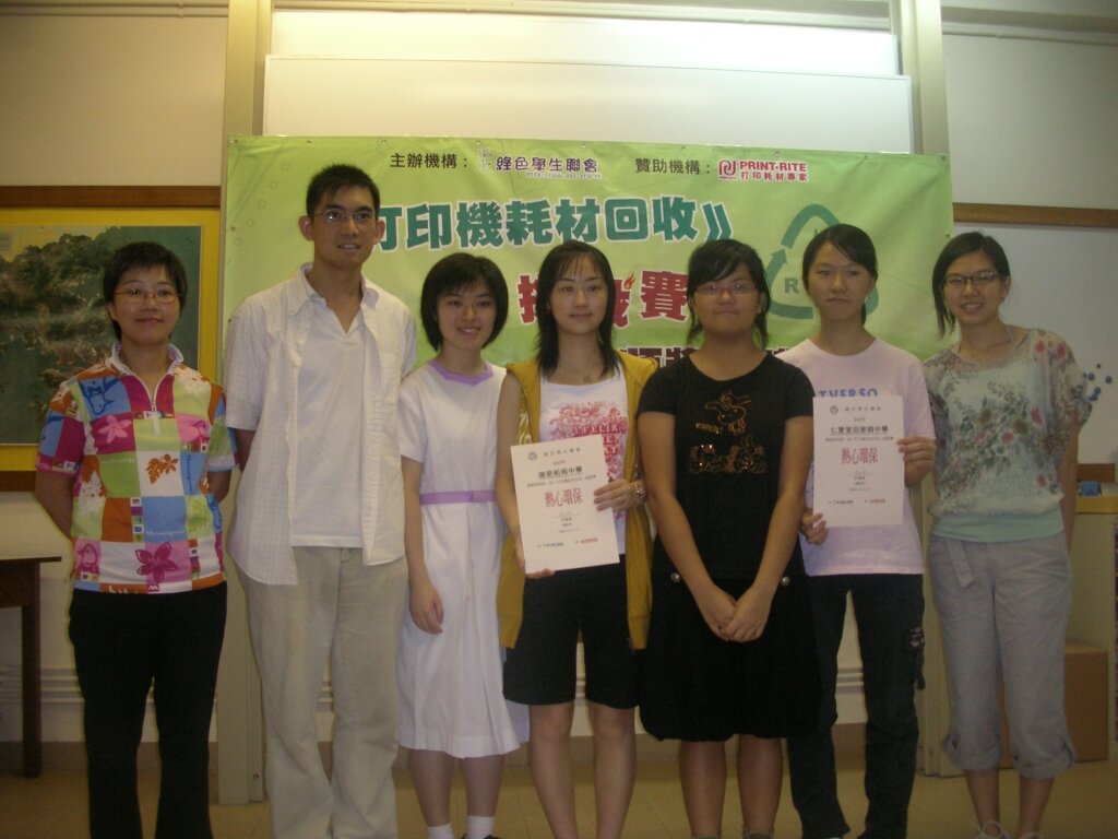 綠色學生聯會藉首個學界打印耗材回收比賽宣揚綠色打印概念,以增加打印耗材的回收再生率;使學生認識回收的重要及了解再生產品對環境的好處。是次比賽於本年3月至6月期間舉行,反應熱烈,共逾二十間學校參與,並回收達500個打印耗材。所有參與是次比賽的學校更可到珠海的打印耗材回收再造廠進行實地考察,了解耗材回收後的處理及再生墨盒及碳粉匣過程。