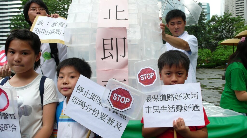 綠學聯四月調查發現全港依然有40%的小學使用即棄飯盒,一年內即棄置約三千萬個飯盒。過去五年本會一直要求教育局明確制定學校選擇午膳供應商時,必須採用可重用餐盒餐具或即場分飯,以減少廢物及廚餘,並儘快訂下推行環保午膳的時間表、制訂具體具約束力的政策及推出配合措施及配套協助學校,讓本港小學能全面推行即場分飯或採用可重用餐盒。