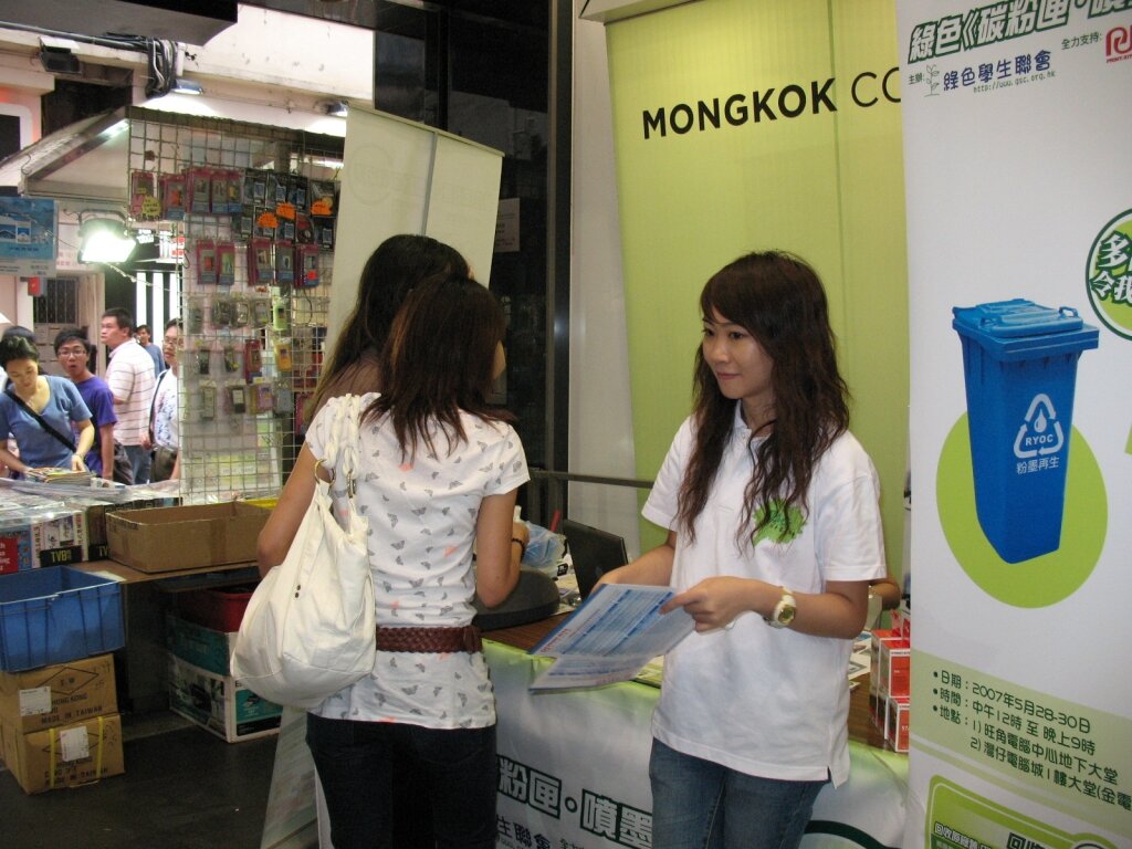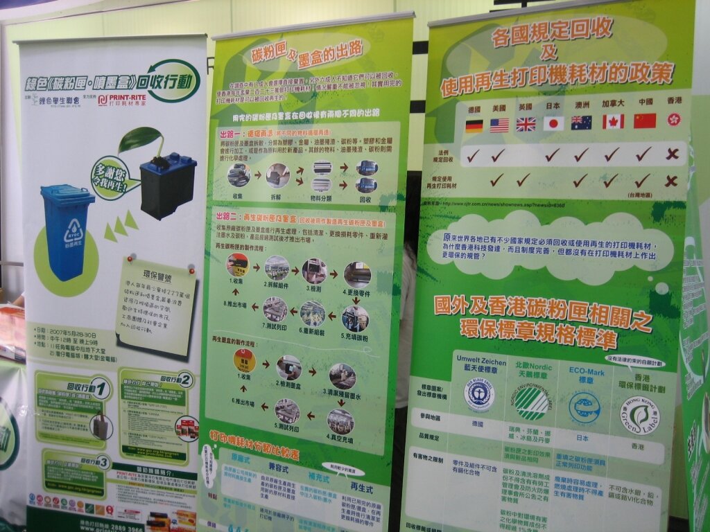 綠色學生聯會舉行碳粉匣/墨盒回收行動,提供回收渠道,讓市民參與回收。市民只要帶同用完的碳粉匣或噴墨盒到旺角電腦中心地下或灣仔電腦城一樓的回收站,便可以獲得環保購物袋,甚至有機會獲得兼容的再生碳粉匣或噴墨盒。