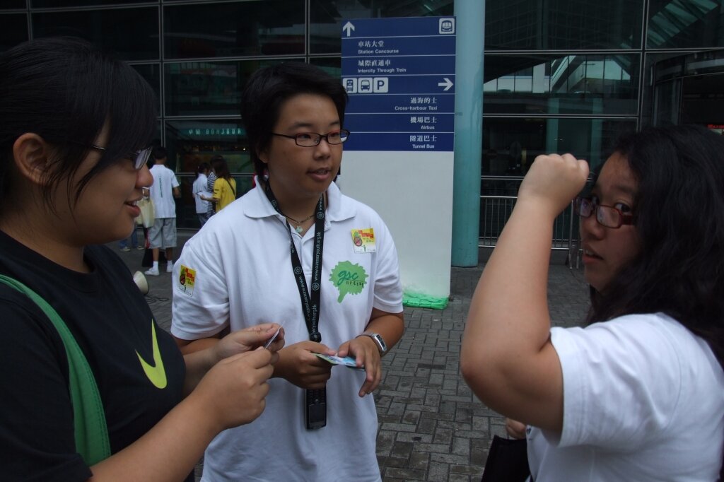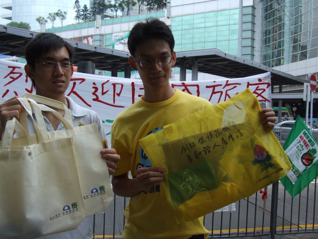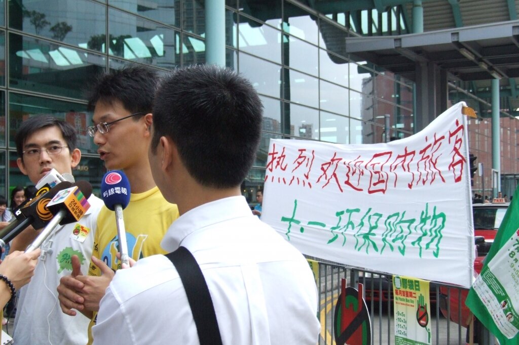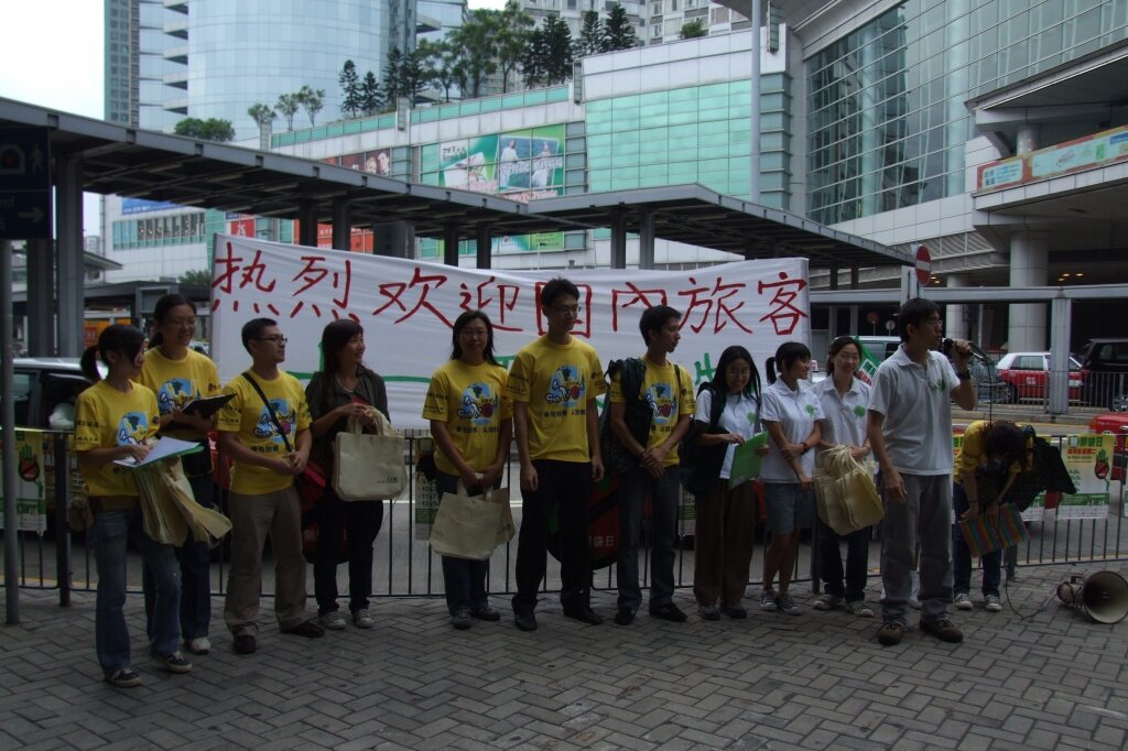 本會更特別邀請了舉辦首個國內「無膠袋日」的佛山市青年志願者協會 9名志願者來港交流舉辦無膠袋日的經驗。他們在紅碪火車站高舉『热烈欢迎国内旅客,十‧一环保购物』的橫額,以別開新面的形式迎接國內旅客,透過大聲公呼籲國內旅客響應「無膠袋日」,外出自備購物袋。同時,還免費派發無膠袋日年曆卡,又邀請即場邀請旅客簽寫承諾書,只需承諾於十‧一黃金週購物時少用膠袋,便可獲贈環保購物袋一個。