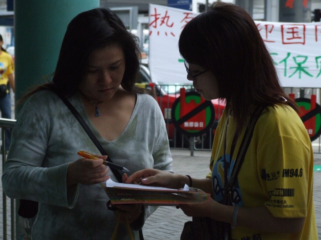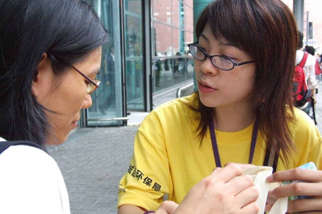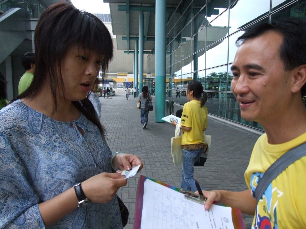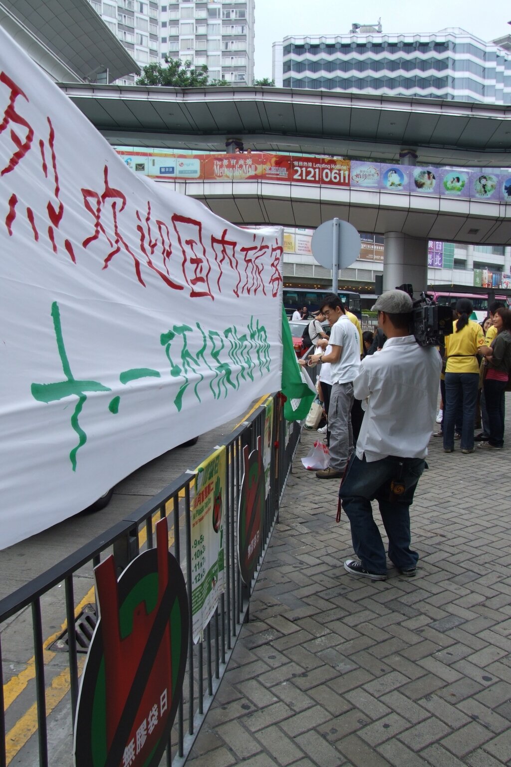 本會更特別邀請了舉辦首個國內「無膠袋日」的佛山市青年志願者協會 9名志願者來港交流舉辦無膠袋日的經驗。他們在紅碪火車站高舉『热烈欢迎国内旅客,十‧一环保购物』的橫額,以別開新面的形式迎接國內旅客,透過大聲公呼籲國內旅客響應「無膠袋日」,外出自備購物袋。同時,還免費派發無膠袋日年曆卡,又邀請即場邀請旅客簽寫承諾書,只需承諾於十‧一黃金週購物時少用膠袋,便可獲贈環保購物袋一個。