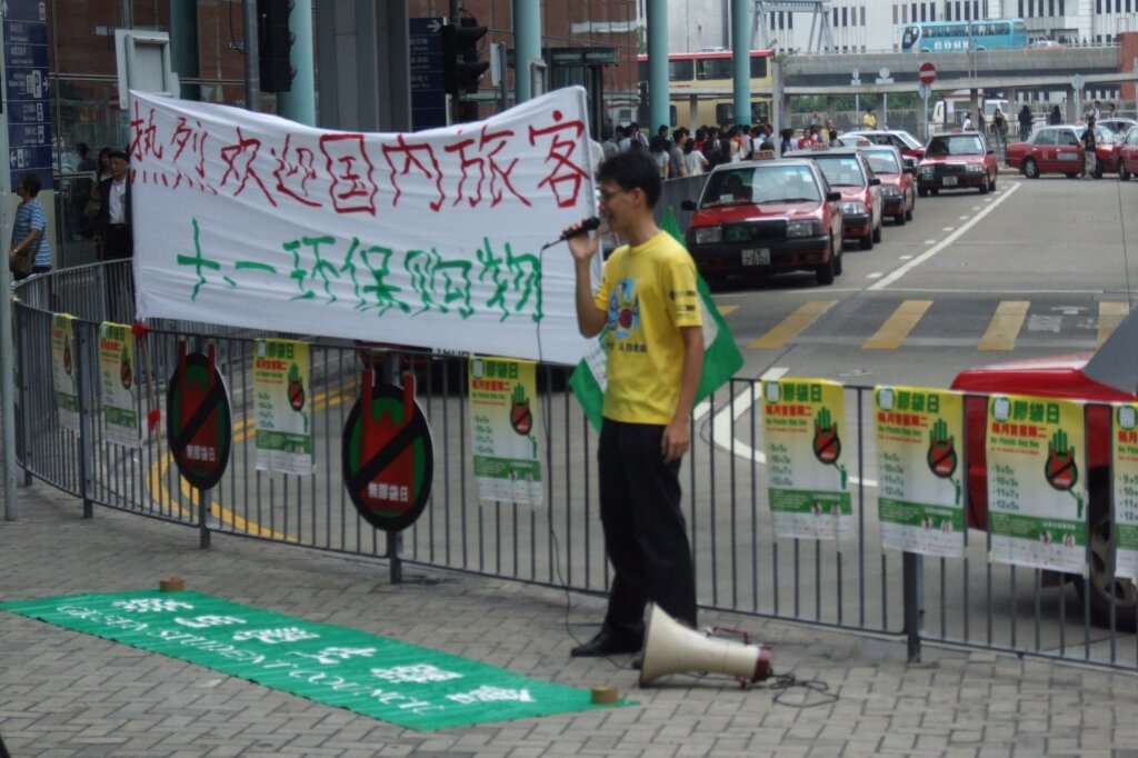 適逢10 月3 日的無膠袋日在十‧一黃金週期間,是國內旅客來港旅遊購物的高峰期,入境處預計今年國慶日及中秋節假期(9月29日至10月8日)10天期間,估計有567萬人次經海陸空進出本港;預計羅湖口岸,每日有27萬人次出入境。綠學聯為了提醒內地旅客購物時,減少使用膠袋,建立香港國際環保之都的形象,特意舉辦「十一無膠袋購物黃金週」之宣傳活動,於9月30日及10月1日分別於紅碪火車站及旺角行人專區向遊客宣傳無膠袋訊息。