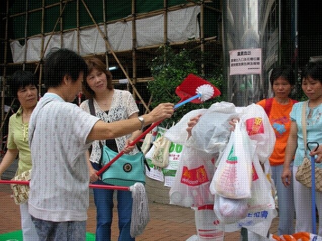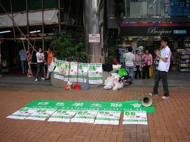 綠學聯繼前天與牛棚蛙王博物館舉行膠袋藝術裝置表演,今天又聯同香港婦女勞工協會舉行地球日---婦女無膠全接觸,以響應世界地球日及明天的「每月無膠袋日」,香港婦女勞工協會的十多名婦女帶頭向街上的主婦提倡減少使用膠袋,帶出膠袋泛濫帶來的災害,並呼籲市民減少使用膠袋,支持6月6日「無膠袋日」這環保盛事。