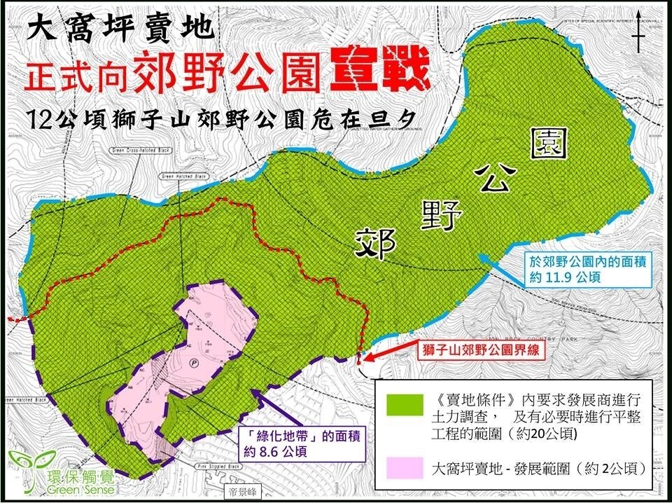 地政總署將於2015年9月18日就大窩坪綠化地賣地截標,但一眾環保團體發現,因為賣地地皮位於地型複雜之山坡,加上距離獅子山郊野公園過近,署方竟將大片郊野公園範圍於賣地同時交到發展商手中,使其可隨時以安全為名,於郊野公園內平整土地及進行各種鞏固工程。我們認為署方此舉無異將郊野公園「出賣」,是政府試行大規模開發郊野公園的第一步!