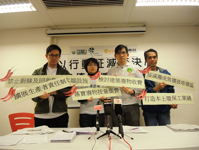 Greeners Action, Friends of the Earth (HK), the Conservancy Association and Green Power have jointly demanded the government to pledge to adopt six measures before applying for the appropriation bill of landfill expansion and incinerators to the Legislative Council in order to show its determination of waste reduction.