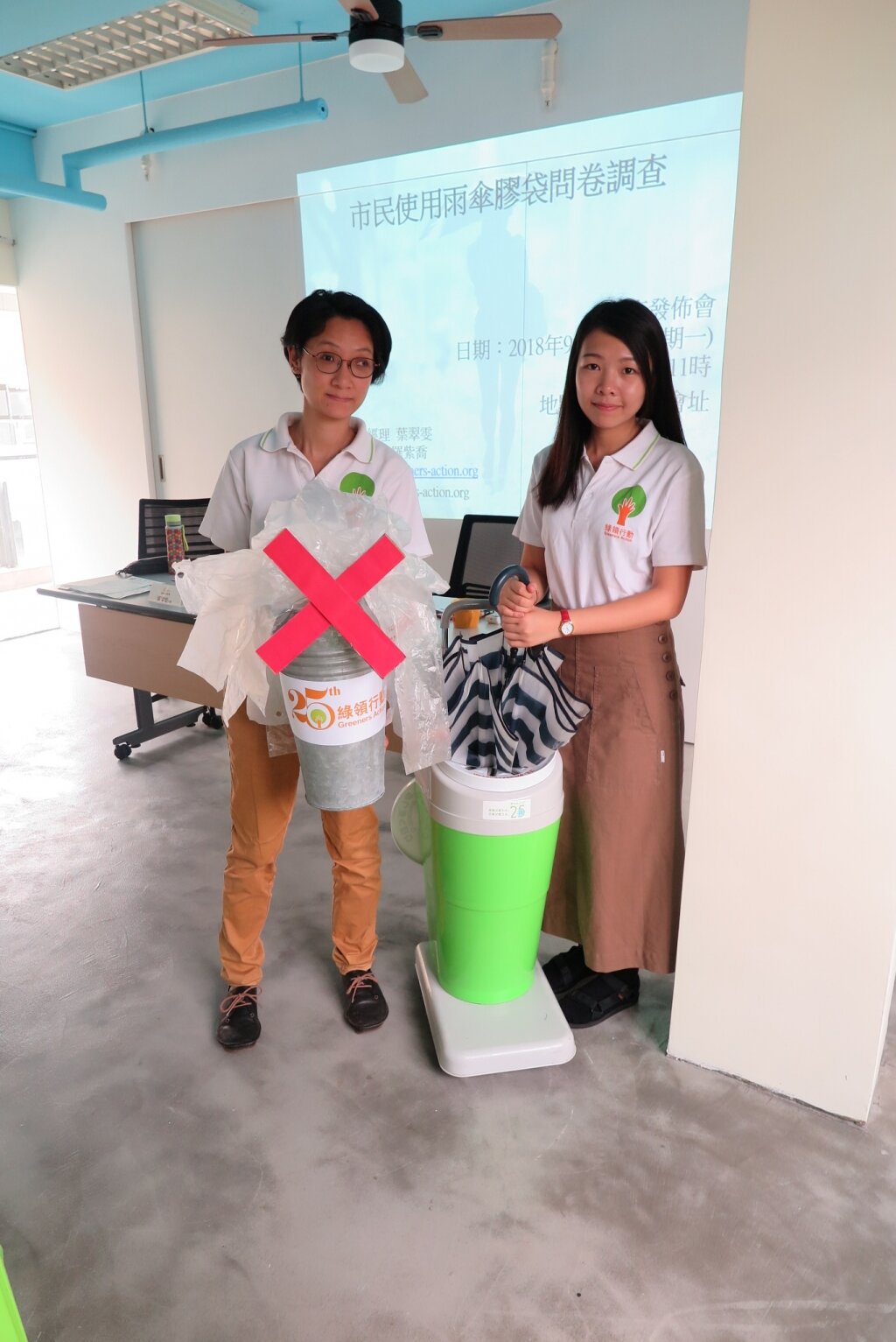 每年雨季,雨傘膠袋於香港氾濫成災,雨傘膠袋擠滿甚至溢出垃圾桶至滿地的情況隨處可見。有見及此,綠領行動(綠領)於本年度進行「市民使用雨傘膠袋問卷調查」,欲了解市民下雨天時使用雨傘膠袋的習慣。調查於下雨天時訪問867名市民,發現63%市民有使用雨傘膠袋的習慣,其中72%市民認為使用雨傘膠袋是不環保行為。另外,有80%市民曾嘗試使用其他有效取締方法去避免取用全新雨傘膠袋。
