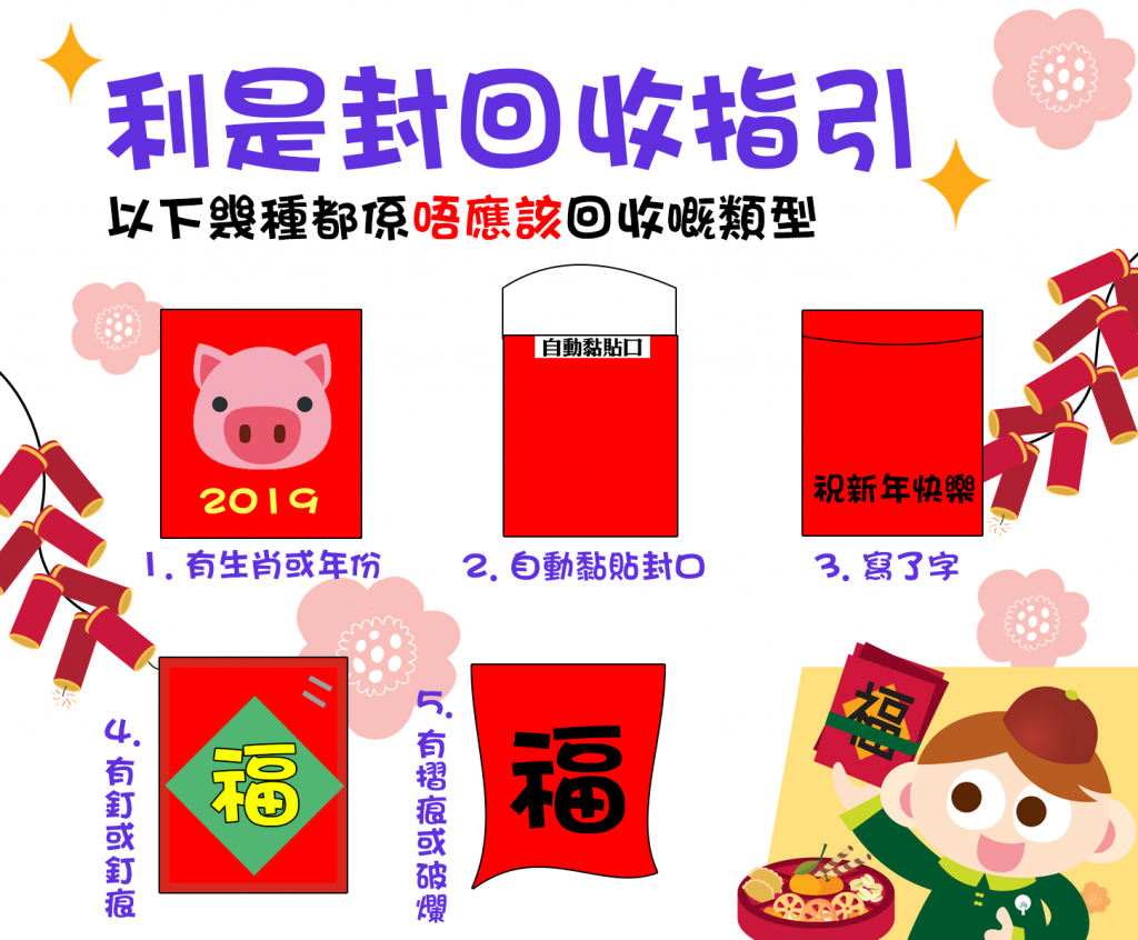 “Lai See Reuse and Recycle Program 2019” was officially started today, 12th February, 2019, for people to recycle red pocket, there are over 460 public recycling points in the territory. Please press “public recycling points” for detailed addresses.