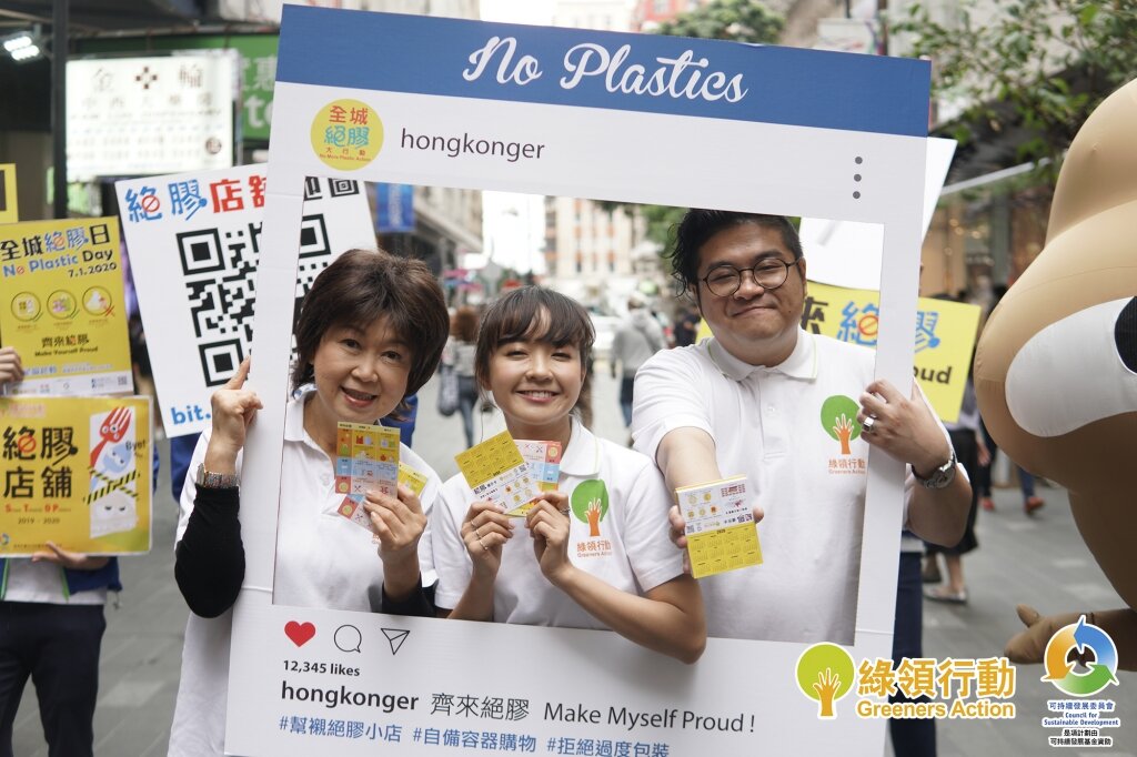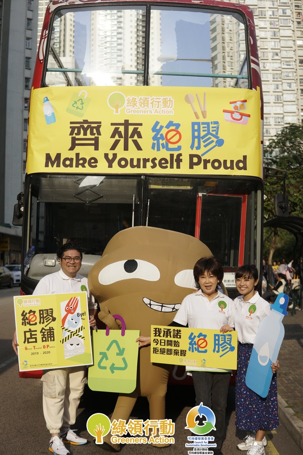 Star Ambassadors then got on the promotional bus hanged “齊來絕膠Make Yourself Proud” and traveled in Hong Kong Island to promote “No Plastic Map”. Up to now, GA has invited 52 community restaurants and shops to join “No More Plastic Action”. All the shops were recorded on “No Plastic Map”. Citizens can open the online map to search and patronize the shops in order to reduce disposable plastics.