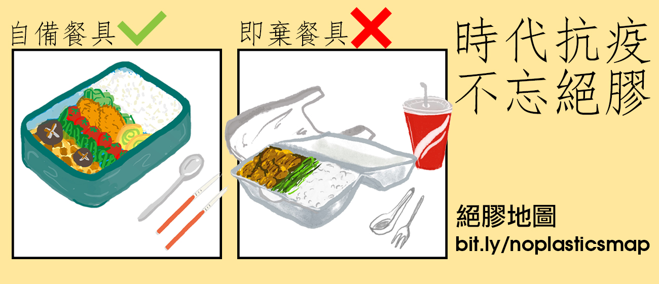 本會建議市民多點在家煮食,如果想買外賣亦可以參閱「絕膠地圖」, 瀏覽全港歡迎自備餐具買外賣的餐廳食肆,抗疫時期不忘絕膠,自救之餘亦救救地球。