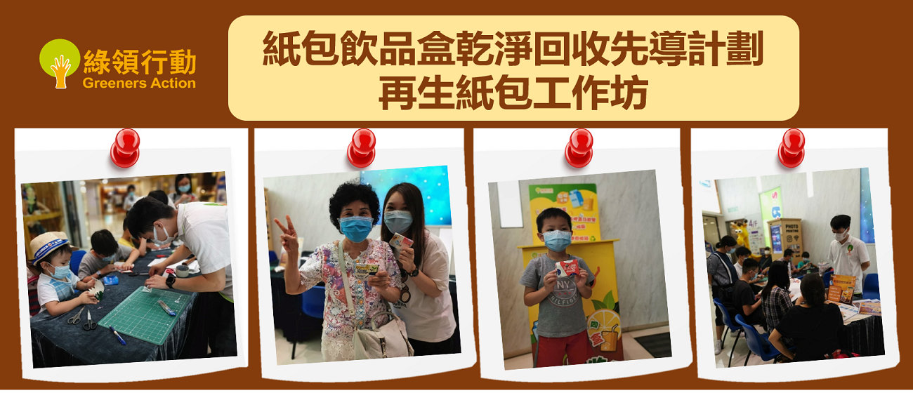 紙包飲品盒回收工作未因肺炎疫情停下來,本會於過去數個月在尖沙咀The One以及銅鑼灣皇室堡舉辦多場紙包飲品盒回收工作坊,讓參加者認識紙包飲品盒的回收過程以及體驗製作再生錢包。