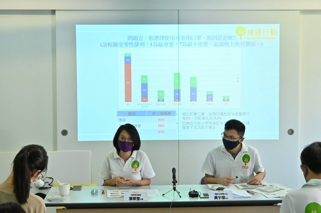 新冠肺炎疫情肆虐下,市民配戴口罩防疫成為指定動作。綠領行動於過去一個月就疫情下市民使用口罩的習慣進行網上問卷調查,超過90%受訪者表示慣常使用即棄口罩,估計疫情爆發至今,香港市民共消耗20億個即棄口罩,只有不足10%的人使用可重用口罩。但若果疫情持續,近七成使用即棄口罩人士指會支持使用可重用口罩。綠領行動同時調查市面部份可重用口罩,當中亦具備高效能的過濾標準,防護能力不遜於即棄口罩。即棄口罩造成的環境問題已成為國際社會關注的焦點,綠領行動建議政府為可重用口罩制訂清晰的使用指引,並從源頭減廢和回收再造方向,減少即棄口罩對環境造成的破壞。