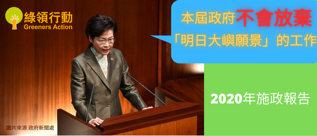 但另一方面,行政長官表明不會放棄推動「明日大嶼」,綠領行動表示極度失望。現時香港還有大量棕地等土地可供發展,政府亦未有根據最新人口推算報告作需求評估,推動耗資龐大的工程並不划算。而且工程鄰近填海範圍,會令海洋生態造成永久性破壞,永遠無法復原,最終只會得不償失。