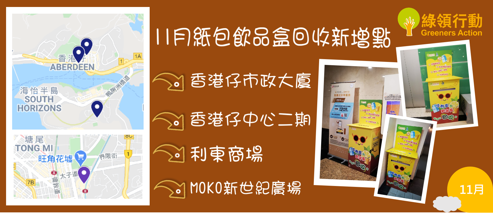 此外,本月MOKO 新世紀廣場增設紙包飲品盒回收箱,途經旺角購物或工作的市民都可以回收紙包飲品盒!未來綠領行動將於各區設立更多回收點,如對回收先導計劃有任何查詢,請電郵至info@greeners-action.org或致電3499-1780與李小姐聯絡。