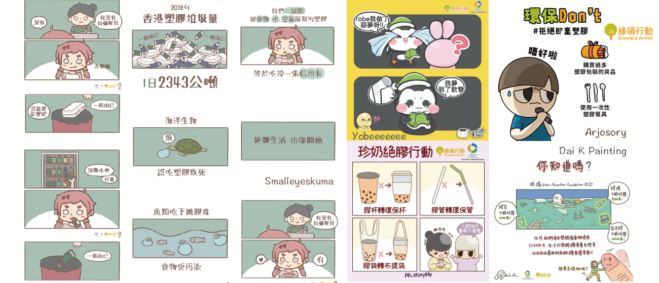 Arjostory希望大家能學會「拒絕使用Refuse」,拒絕過度包裝和一次性塑膠;Yobe關注塑膠對海洋生態禍害,希望大家能在生活中學會減塑;PPStory鼓勵多用可重用的飲管和杯等減少製造即棄塑膠。Dai K Painting透過插圖解釋塑膠難以分解,教育市民「絕膠」的重要性。Smalleyeskuma則反思自己的用膠習慣,開始「絕膠生活」。