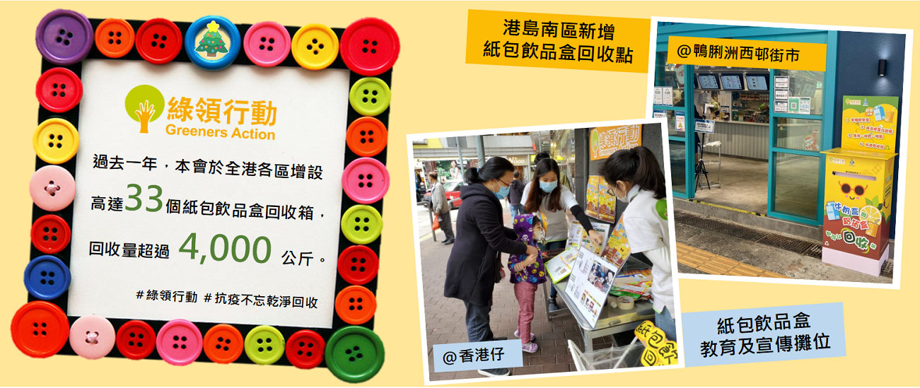 現時綠領行動於全港各區共設有33個紙包飲品盒回收點,全年回收量超過4,000公斤,即使面對疫情的挑戰,本會未有停下回收及教育推廣工作,於各區陸續增設紙包飲品盒回收箱及舉辦多場宣傳教育攤位,鼓勵大家資源回收及減少浪費。