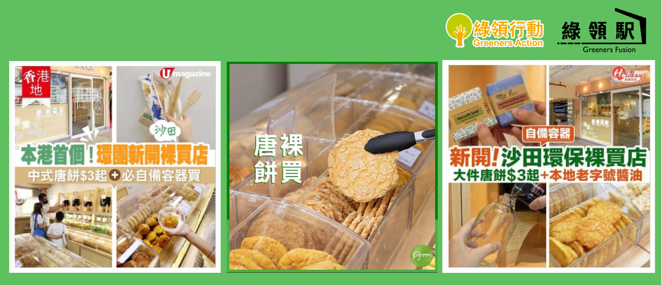 本會首間裸買店—「綠領駅」 Greeners Fusion 在8月份有幸得到Umagazine, 假期日常及夠Green 三間媒體報導,讓更多人認識「綠領駅」及裸買文化。有別於一般裸買店,「綠領駅」出售的物品主打「香港製造」,供應本地生產的唐餅、麵餅、醬油以及環保日用品。歡迎各位親臨「綠領駅」,自備容器如玻璃樽及可重用器皿裸買不同糧食雜貨,用行動拒絕即棄塑膠包裝,或按以下IG 專頁追蹤「綠領駅」最新資訊。