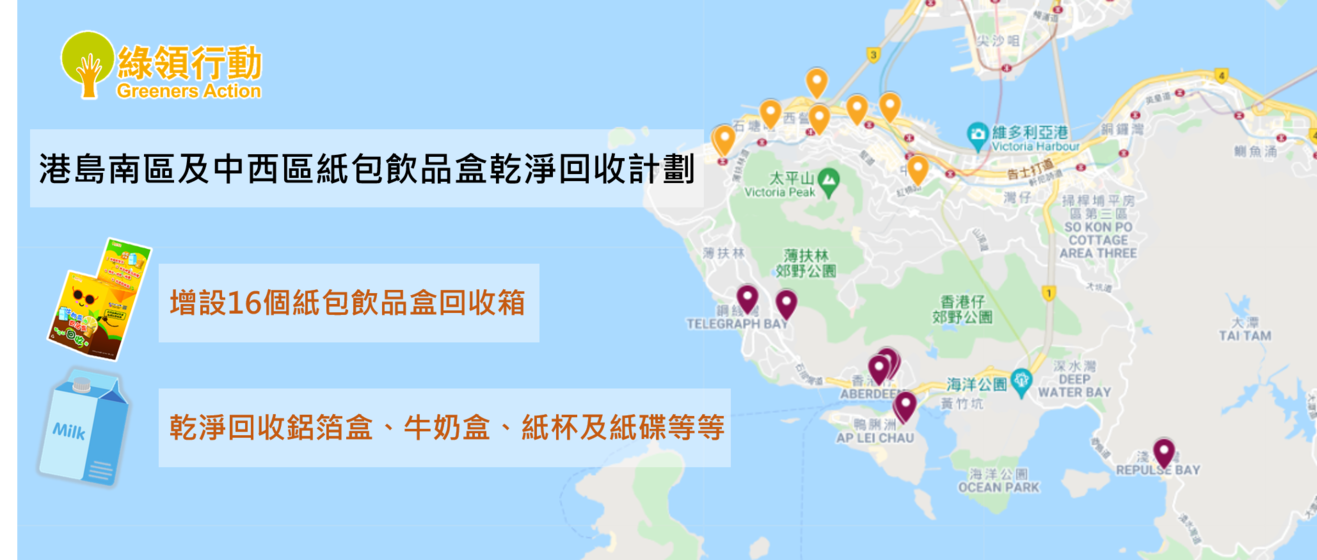 由9月開始,綠領行動將於港島南區及中西區增設合共16個紙包飲品盒回收點及舉辦多場紙包飲品盒宣傳攤位,以供市民學習及乾淨回收鋁箔盒、牛奶盒、紙杯及紙碟等等,有關紙包盒回收箱地點及活動詳情將稍後公佈。