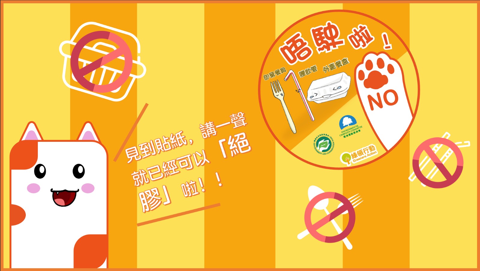 綠領行動已經在全港260間食肆的餐枱及收銀櫃台張貼貼紙,提醒食客下單時走飲管及餐具。各位下次在食肆見到以下貼紙時,記得同侍應講一聲:「唔駛要啲即棄餐具啦!」