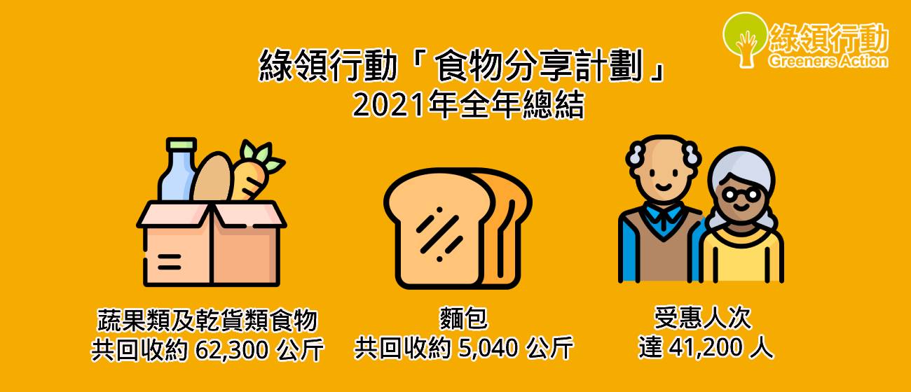 綠領行動「食物分享計劃」在2021年10月1 日至12月31日期間,共在長沙灣及沙田回收約 21,400公斤蔬果及乾貨類食物,比上季上升約15%;麵包收集量及受惠人次則與上季相若,分別為約 1,600公斤及超過 12,700人。