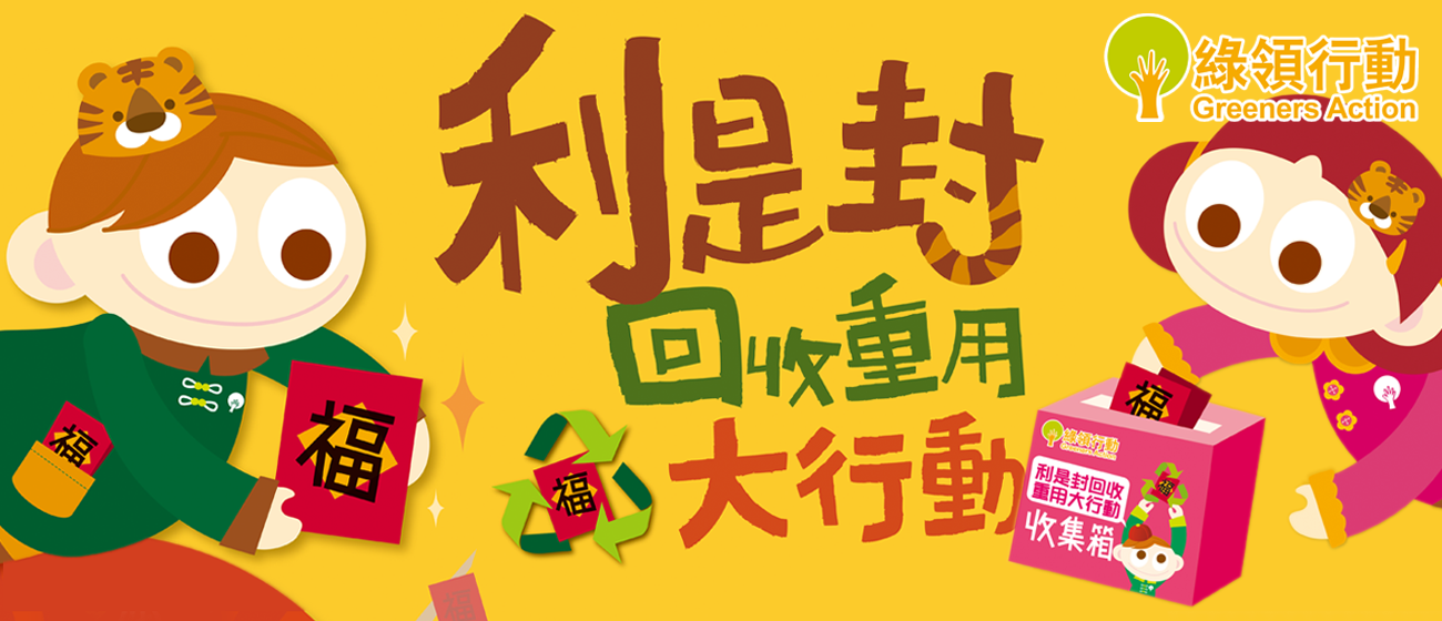 由今年2月10日(初十)至3月2日(三十),市民可於不同的公眾回收點回收利是封,有關名單將於2月初公布。如有意參與利是封回收重用大行動,歡迎與本會葉小姐聯絡( 電話︰3499 1780,電郵︰laisee@greeners-action.org )。