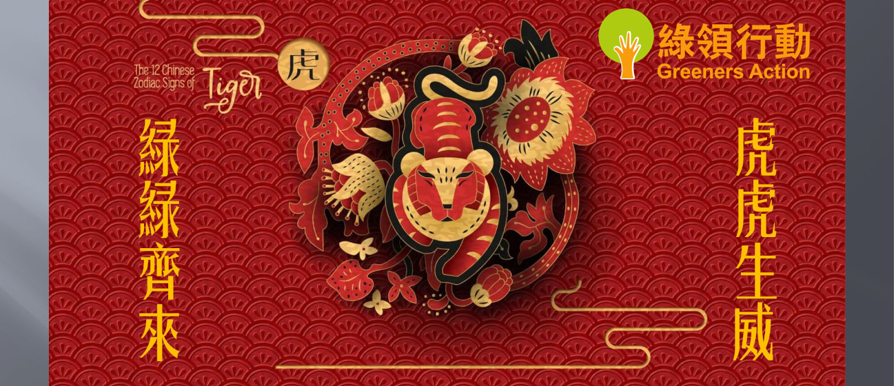 送「牛」迎「虎」,綠領行動仝人恭祝各位壬寅虎年萬事如意,心想事成,身體健康。同時希望大家繼續為環境盡一分力,重用利是封派利是;疫情下,買外賣自備餐具,向即棄餐具和膠袋說不。