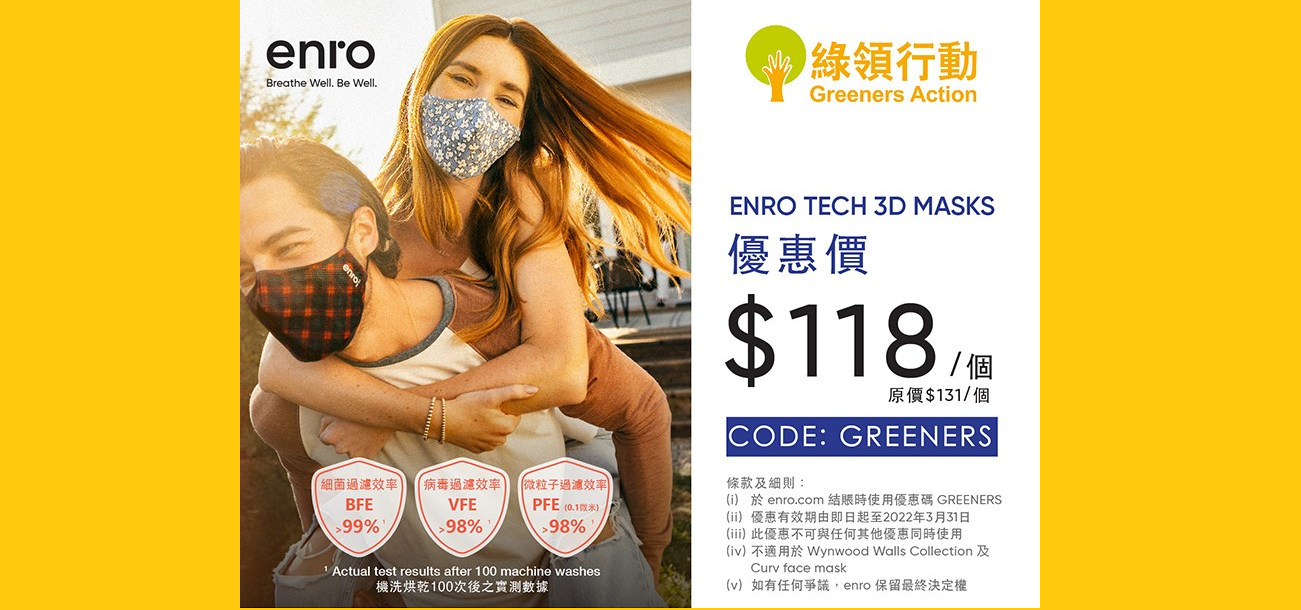 本會最近與TAL Apparel 簽署合作協議,凡於網上購買指定款式的「Enro 可清洗重用口罩」使用優惠碼 "GREENERS" 即可享九折優惠,訂購滿三個更免運費。顧客享有折扣優惠的同時,公司亦會捐款支持綠領行動。