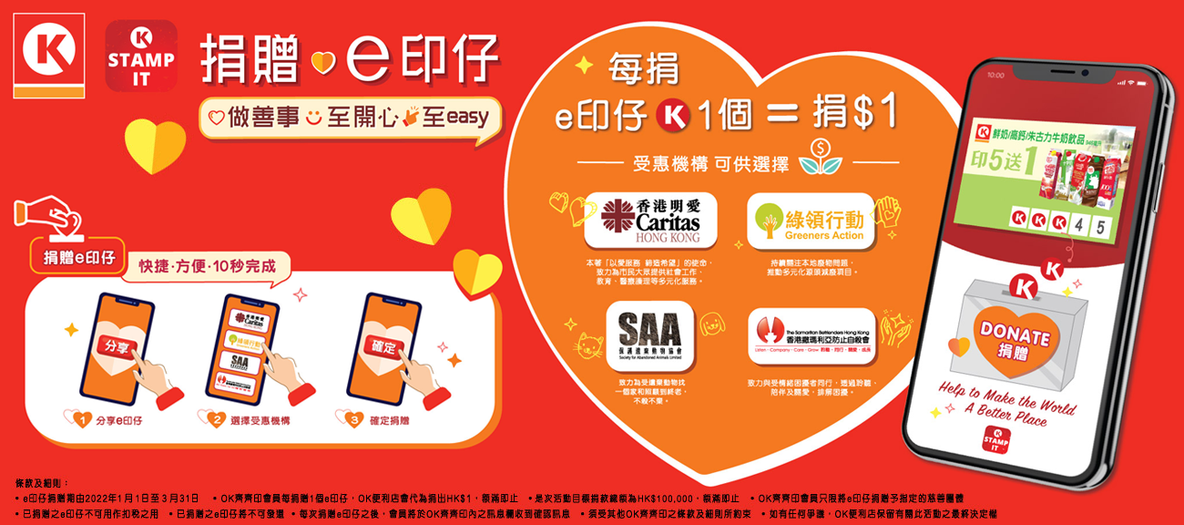 每1個e印仔,OK便利店就會代為捐出港幣1元予本會,捐款目標為港幣10萬元!希望大家踴躍支持!