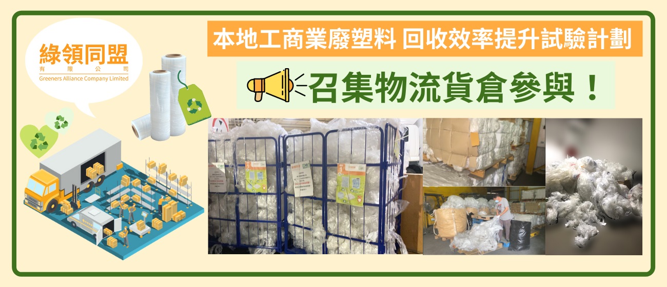綠領行動關連機構—綠領同盟有限公司,繼續得到回收基金資助,於本年3月開展新一期名為「本地工商業廢塑料回收效率提升試驗計劃」,旨在於工商廈及物流貨倉推廣一站式在地包裝膠膜回收方案,包括設置迷你打包機、派遣專人負責打包及回收物流工作等。計劃歡迎每月包裝膠膜棄置量超過1,000公斤的大型物流工廈或貨倉參與,如欲報名及了解詳情,請致電 3499-1780與楊先生聯絡。