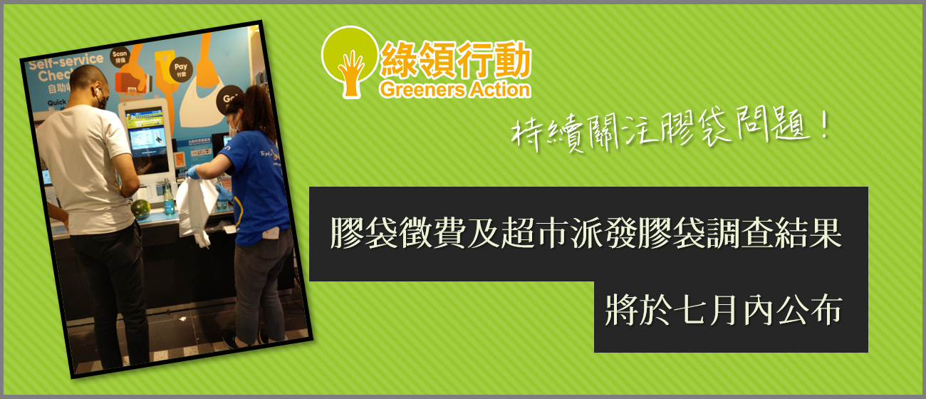 政府擬於今年年底提高膠袋徵費由 $0.5 增至 $1,並取消盛載冷凍食品及非氣密包裝食品用途膠袋的兩項豁免。有見及此,綠領行動在6月中進行兩項調查,分別到全港18區共50間超市分店考察,並點算自助收款處及收銀櫃檯,職員派發及市民取用平口袋和塑膠購物袋 (俗稱「背心袋」)的情況,同時透過網上問卷,了解市民在超市購物時使用「背心袋」的習慣,以及對膠袋徵費水平的意見。綠領行動將於7月,公布兩項調查的詳細結果。
