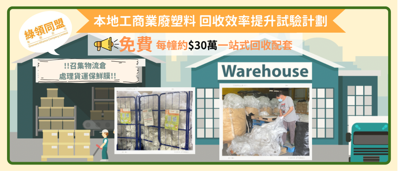 綠領行動關連機構—綠領同盟有限公司得到回收基金資助,本年開展第二期工商廈回收試驗計劃「本地工商業廢塑料回收效率提升試驗計劃」,旨在於工商廈及物流貨倉推廣一站式在地包裝膠膜回收方案,並為每幢參與物業免費提供價值約港幣$30萬元的配套,包括迷你打包機、專人負責打包及回收物流工作等。計劃歡迎每月包裝膠膜棄置量超過1,000公斤的大型物流工廈或貨倉參與。 如欲報名及了解詳情,請致電 3499-1780與楊先生聯絡。