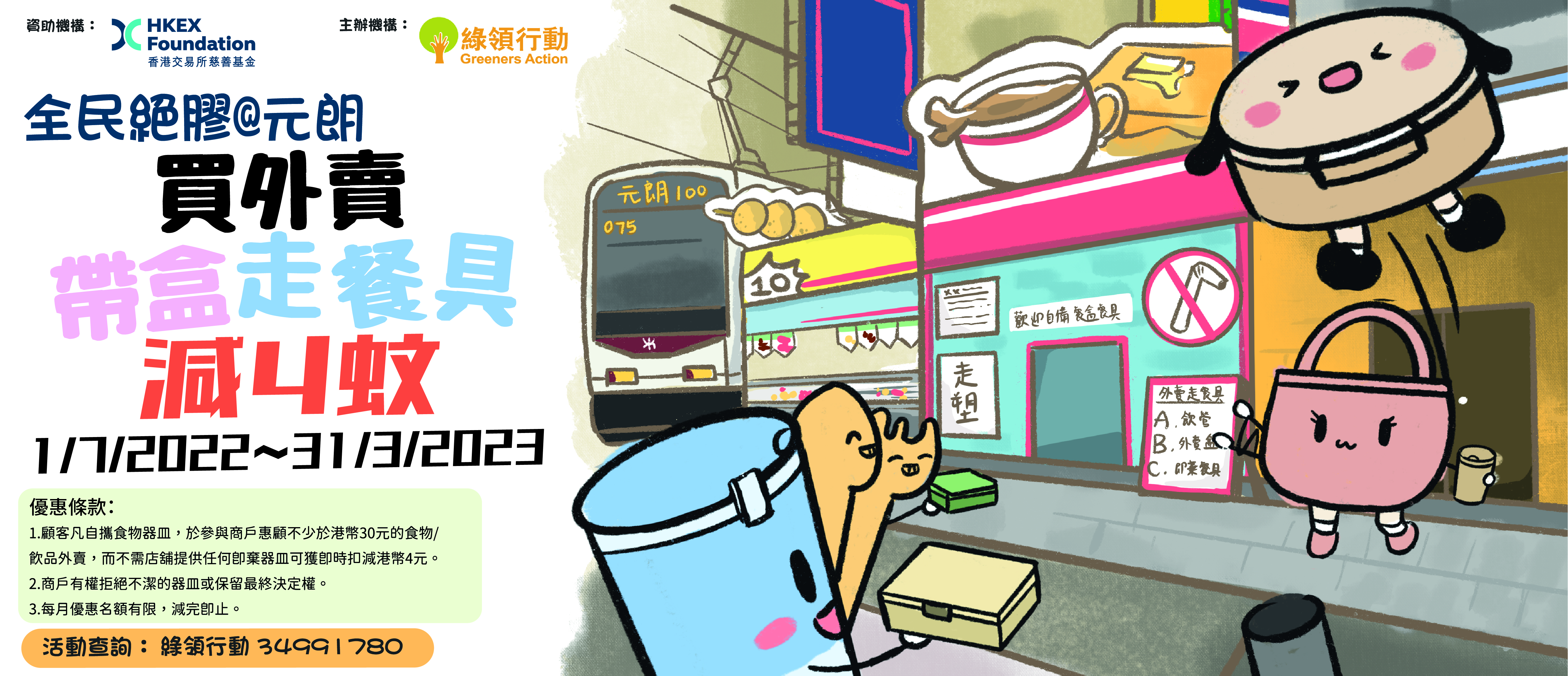 由2022年7月1日至2023年3月31日期間,市民於元朗區內參與項目的30間餐廳,購買金額不少於$30的外賣時,自備可重用餐盒或可重用飲品杯,並且拒絕使用所有即棄塑膠飲管、膠袋及餐具,即可獲$4現金優惠。市民可以在9個月內無限次享用現金優惠,希望藉此減少外賣食品產生的即棄塑膠垃圾,並培養持續的「走塑」習慣。