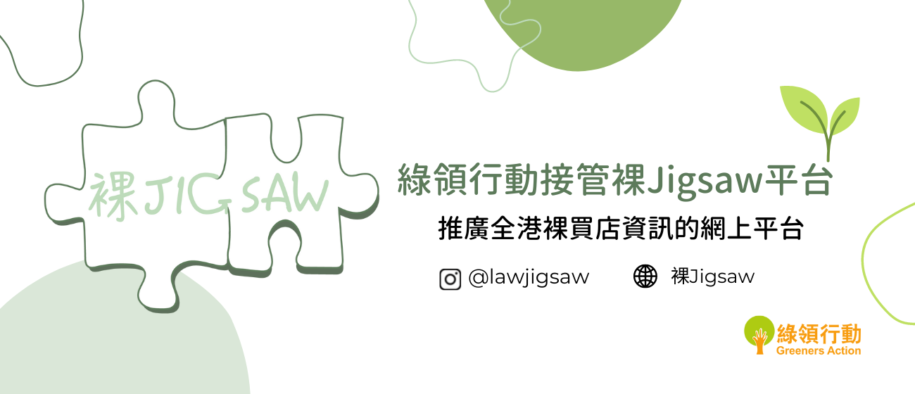 由兩位香港大學環境管理碩士課程的同學,於綠領行動實習時所建立的「裸 Jigsaw」專頁,藉此向市民推廣全港的裸買店資訊。 在同學完成實習期後,「裸 Jigsaw」轉交由綠領行動繼續營運。本會感謝兩位實習同學的努力和信任,並會秉持「裸 Jigsaw」 理念,繼續提供多元裸買資訊,務求廣傳裸買文化,令更多市民認識和建立祼買的習慣。