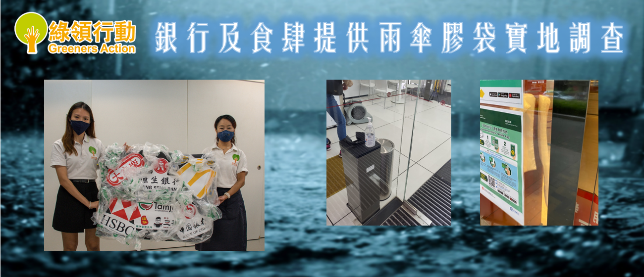 綠領行動於今年7至8月正值雨季期間,到合共183間銀行分行及食肆分店實地調查,了解它們派發雨傘膠袋及設置其他替代措施的情況,結果發現當中112間有提供雨傘膠袋,佔61.2%。銀行有67間有派發雨傘膠袋,佔近78%,當中以中銀(90.91%)及匯豐(90.48%) 最嚴重。食肆則有45間,佔近47%,當中以譚仔(61.5%)及麥當勞(60%)最嚴重。