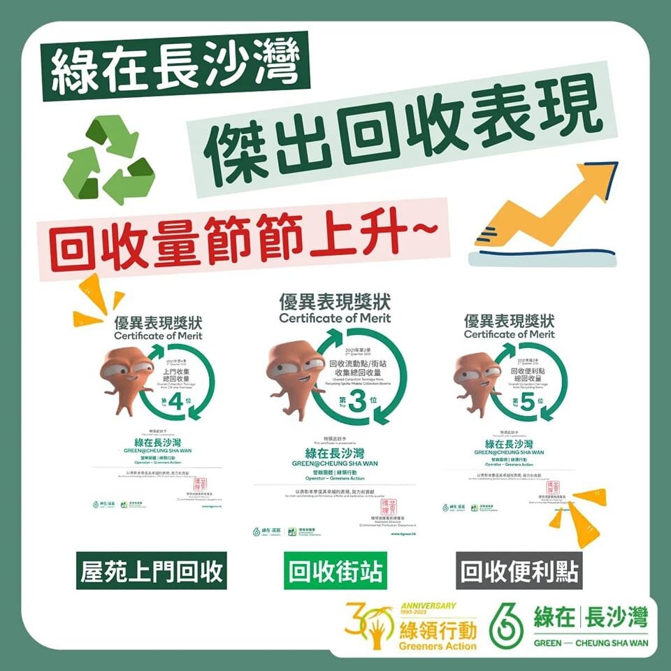 本會於2020年12月至2023年3月負責營運的環保署回收便利點——「綠在長沙灣」,接收不少於8種的指定回收物,包括廢紙、金屬、塑膠(包括發泡膠)、玻璃樽、四電一腦、小型電器、慳電膽及光管、充電池、紙包盒、碳粉匣。收集到的回收物經過分類及暫存,再運送到環保署認可的下游回收商作後續處理。