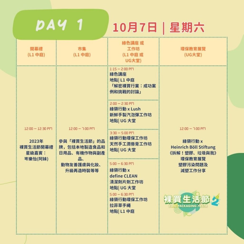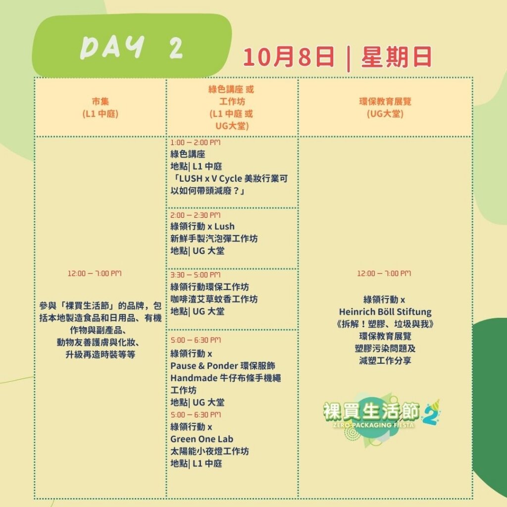 除了「裸買」市集,市民自備容器到場購物並完成任務,更可獲贈免費爆谷或夾糖!活動更設有講座環節、環保教育展覽和環保工作坊,在愉快氣氛下鼓勵大家踏出無塑「裸買」第一步,消除對「裸買」的誤解,自備購物容器購買綠色產品,並進一步推廣本地永續城市的消費模式,一起培養可持續消費習慣,提升環境與市民的消費質素。